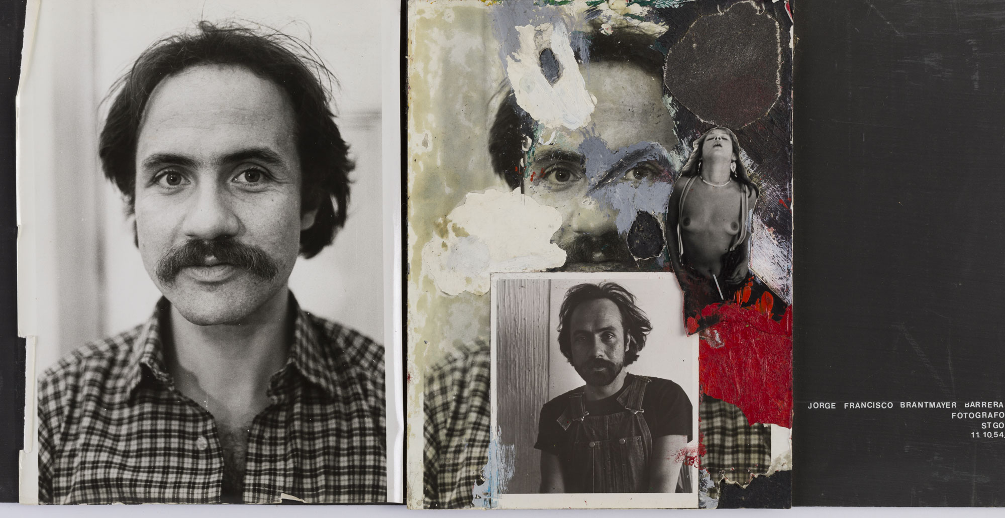 Fotografía en blanco y negro, de formato horizontal. Composición en base a díptico con dos retratos idénticos de una figura masculina de busto. El hombre viste camisa a cuadros, tiene bigote y dirige la mirada al frente. En la segunda imagen se observa una intervención de mancha a lo largo de toda la superficie del retrato de los colores blanco, rojo, azul y negro. Una fotografía del retratado descanza en la zona central superior y una figura femenina en la parte derecha del rostro. La ilumianción es frontal y el fondo es claro.