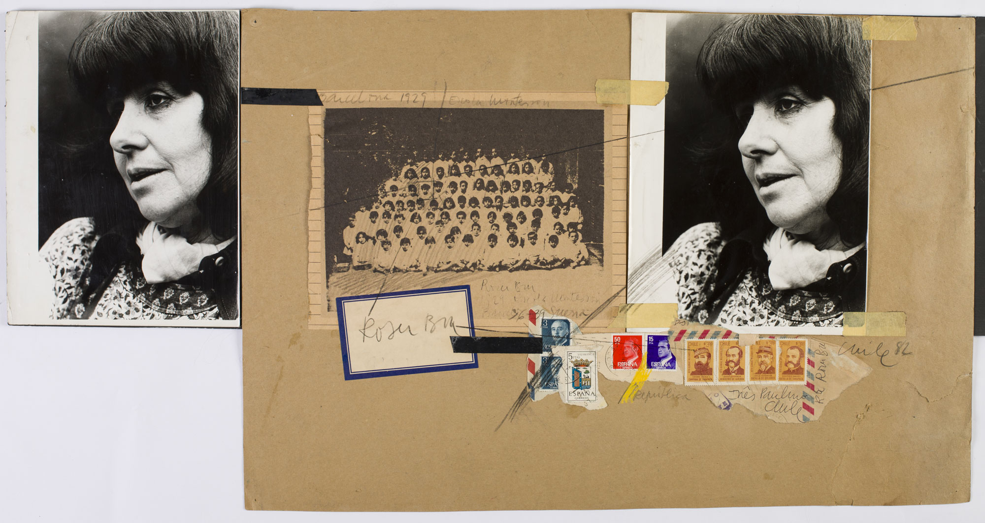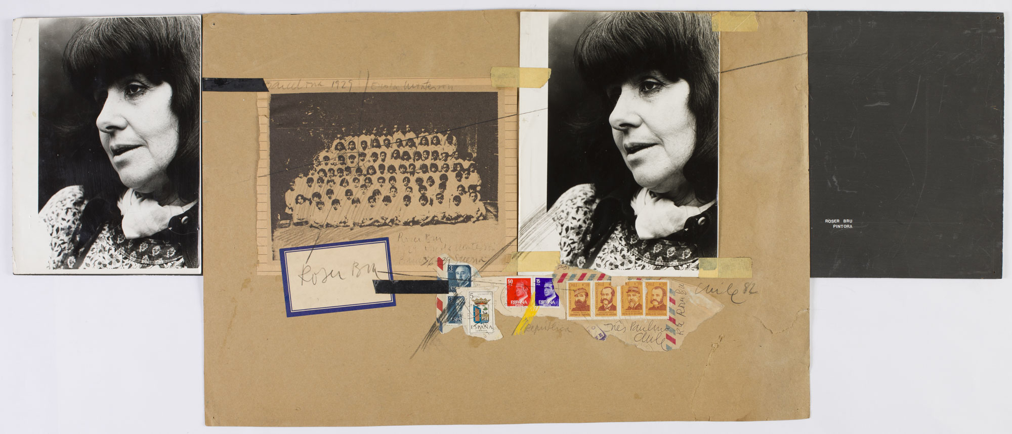 Fotografía en blanco y negro, de formato horizontal. Composición en base a dos copias idénticas de un mismo retrato de una figura femenina de perfil. La mujer viste suéter de patrón y dirige la mirada al costado izquierdo. En la segunda imagen se observa una intervención sobre un fondo neutro y amplio. Al lado izquierdo del retrato una imagen con varias figuras humanas, parches y estampas de variados colores. Firma y palabras en manuscrito con negro. El fondo es oscuro y la ilumianción es frontal.