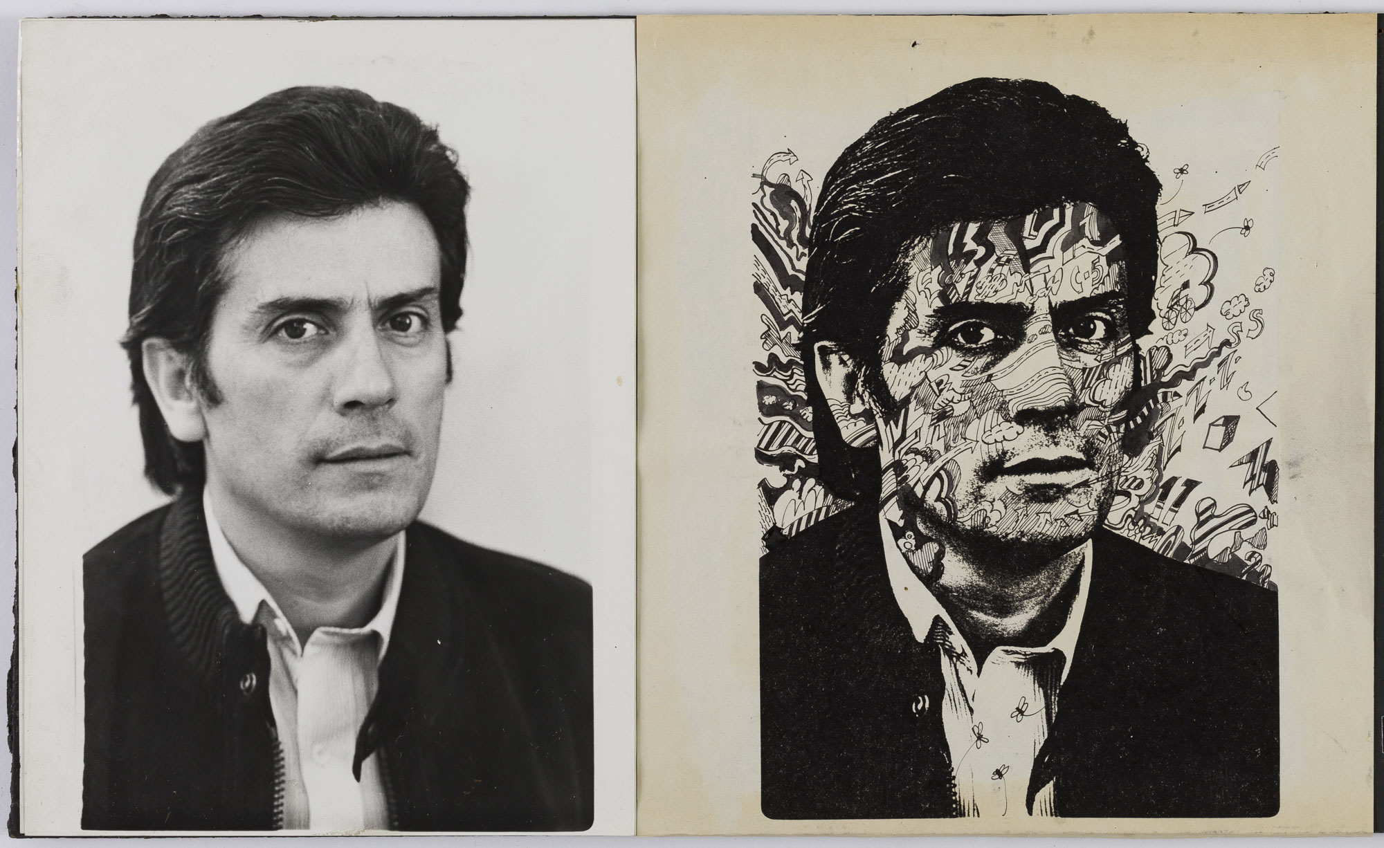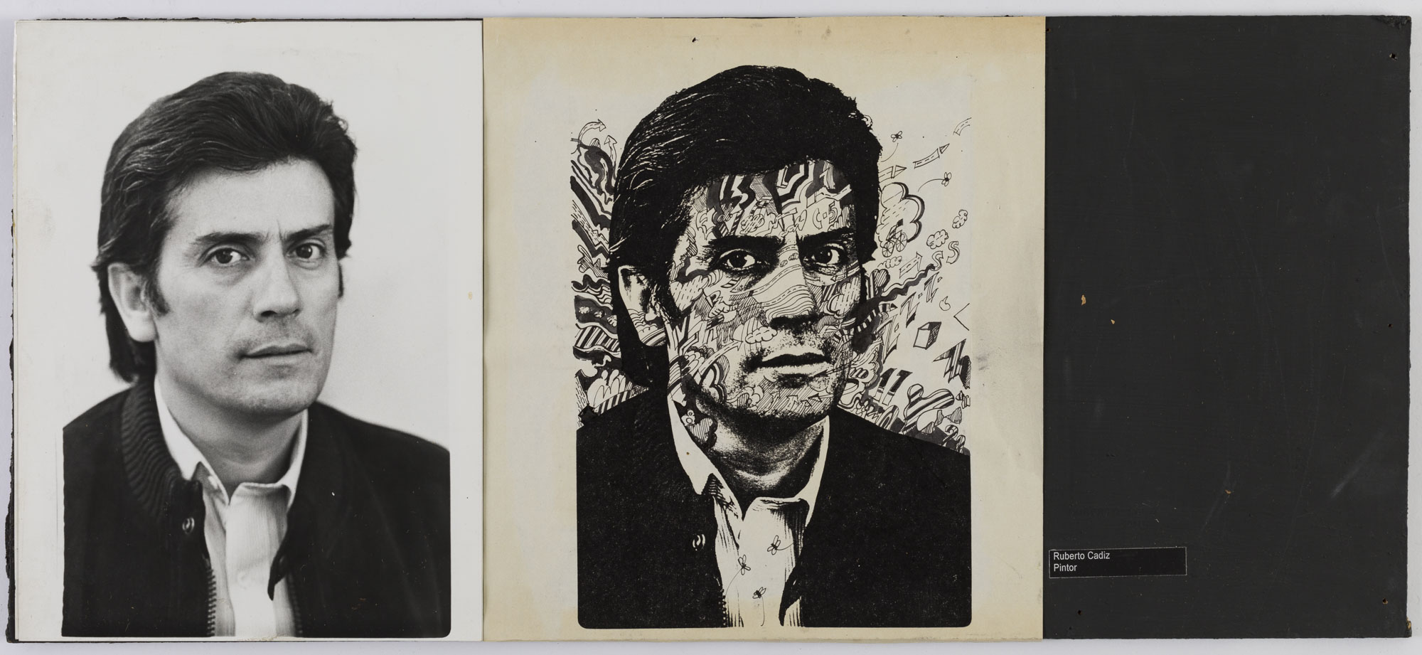 Fotografía en blanco y negro, de formato horizontal. Composición en base a díptico con dos retratos idénticos de una figura masculina de busto. El hombre viste chaqueta oscura, camisa clara y dirige la mirada al frente. En la segunda imagen se observa una réplica del retrato en negro, con figuras variadas en el fondo y el rostro del retratado. El fondo es claro y le iluminación es frontal.