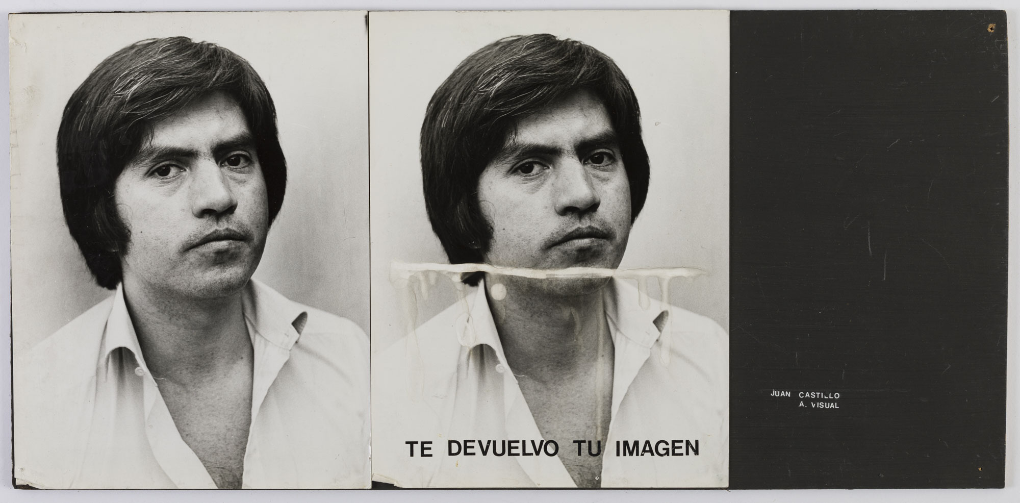 Fotografía en blanco y negro, de formato horizontal. Composición en base a díptico con dos retratos idénticos de una figura masculina de busto. El hombre viste camisa clara y dirige la mirada al frente. En la segunda imagen se observa una intervención con palabras en negro en la zona inferior. El fondo es claro y la ilumianción es frontal. Una mancha blanca atraviesa la imagen y decanta hacia abajo de forma irregular.