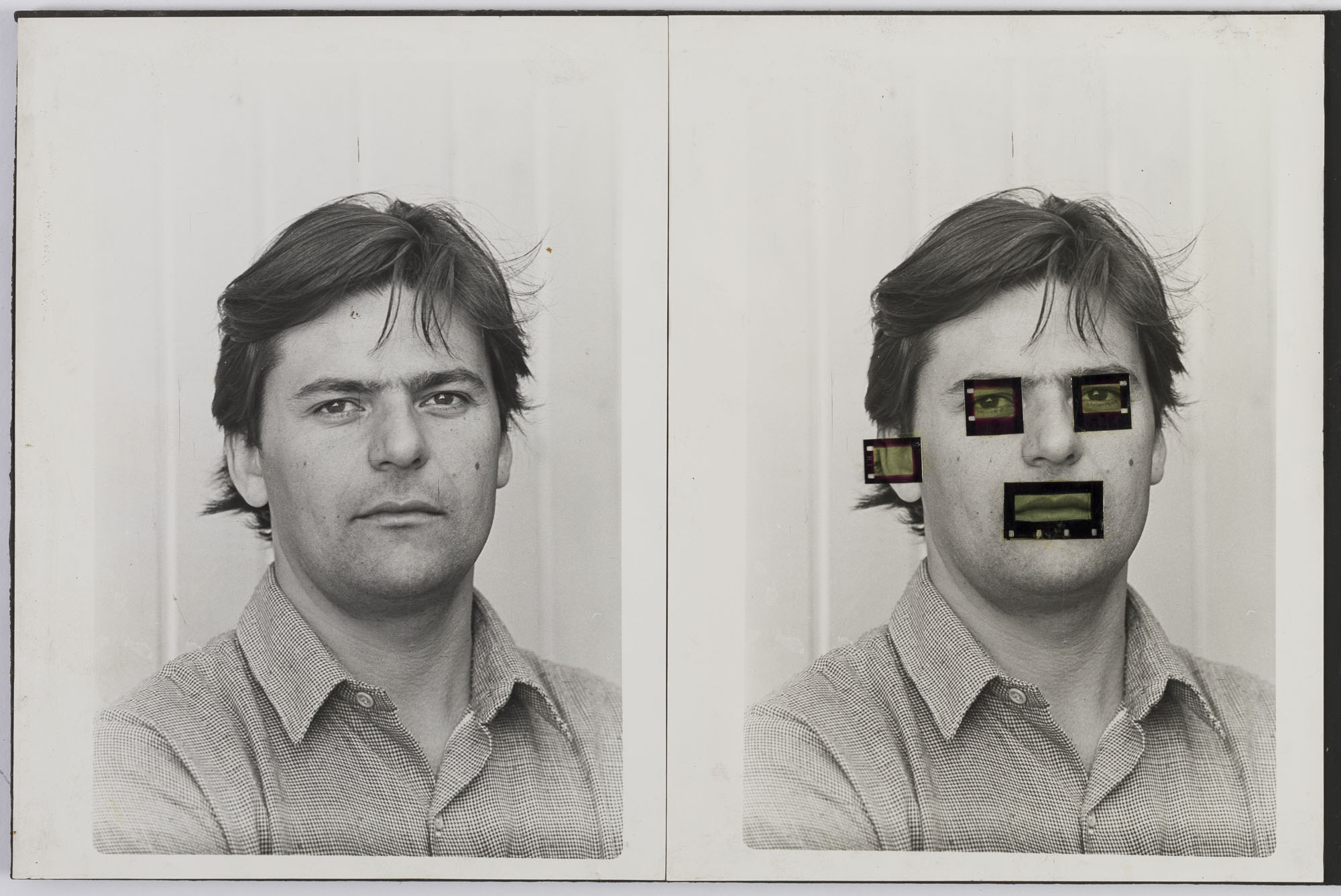 Fotografía en blanco y negro, formato horizontal. Composición en base a díptico con dos copias idénticas de un mismo retrato de una figura masculina de busto. El hombre viste camisa de patrón y dirige la mirada al frente. En la segunda imagen se observa una intervención con mica verde en los ojos, la boca y la oreja izquierda. El fondo es claro y la iluminación es frontal.