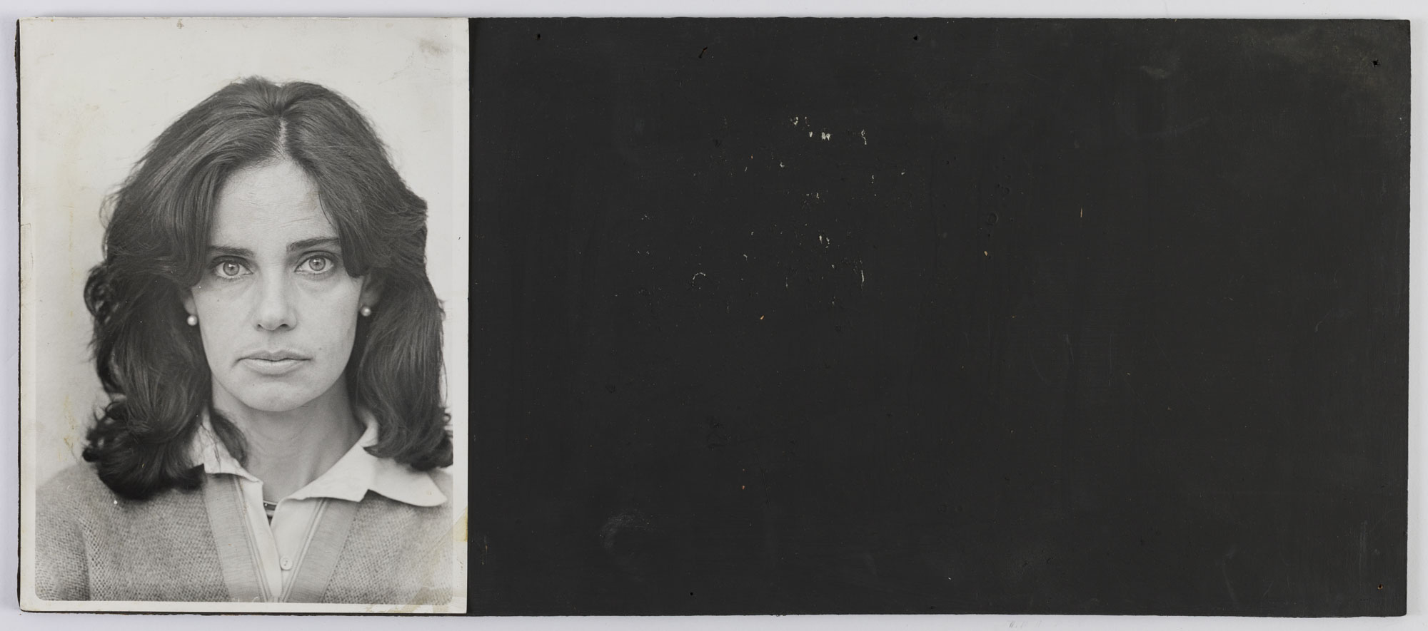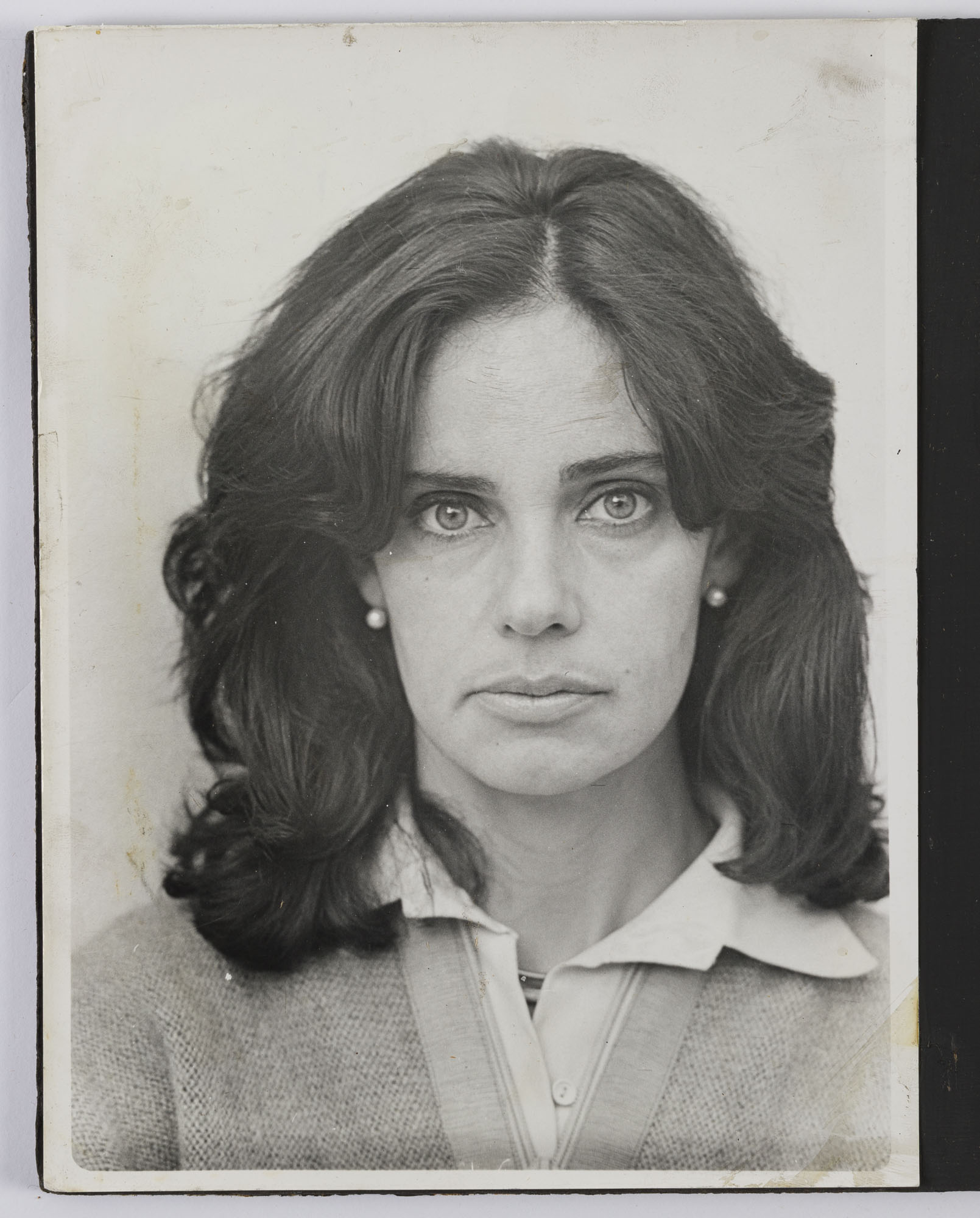 Fotografía en blanco y negro, de composición vertical. Composición en base a retrato de una figura femenina de busto. La mujer viste suéter, camisa clara, aros circulares y dirige su mirada al frente.
