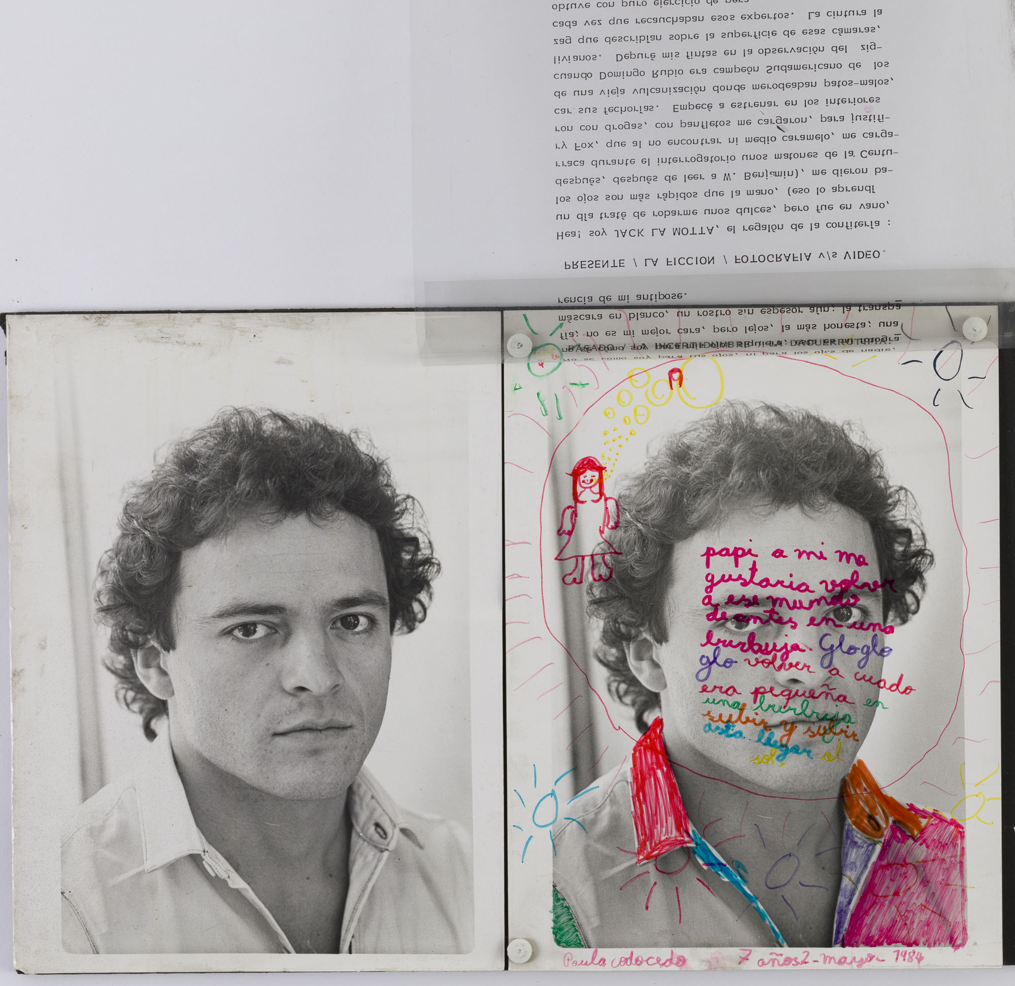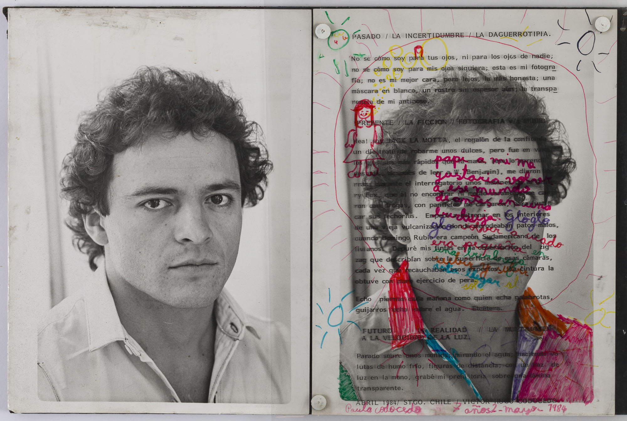 Fotografía en blanco y negro, de formato horizontal. Composición en base a díptico con dos retratos idénticos de una figura masculina de busto. El hombre viste camisa clara y dirige la mirada al frente. En la segunda imagen se observa una intervención con una mica transparente, mecanografiada con palabras en color negro y figuras de color rojo, verde, amarillo y azul. El fondo es difuso y la iluminación es frontal.