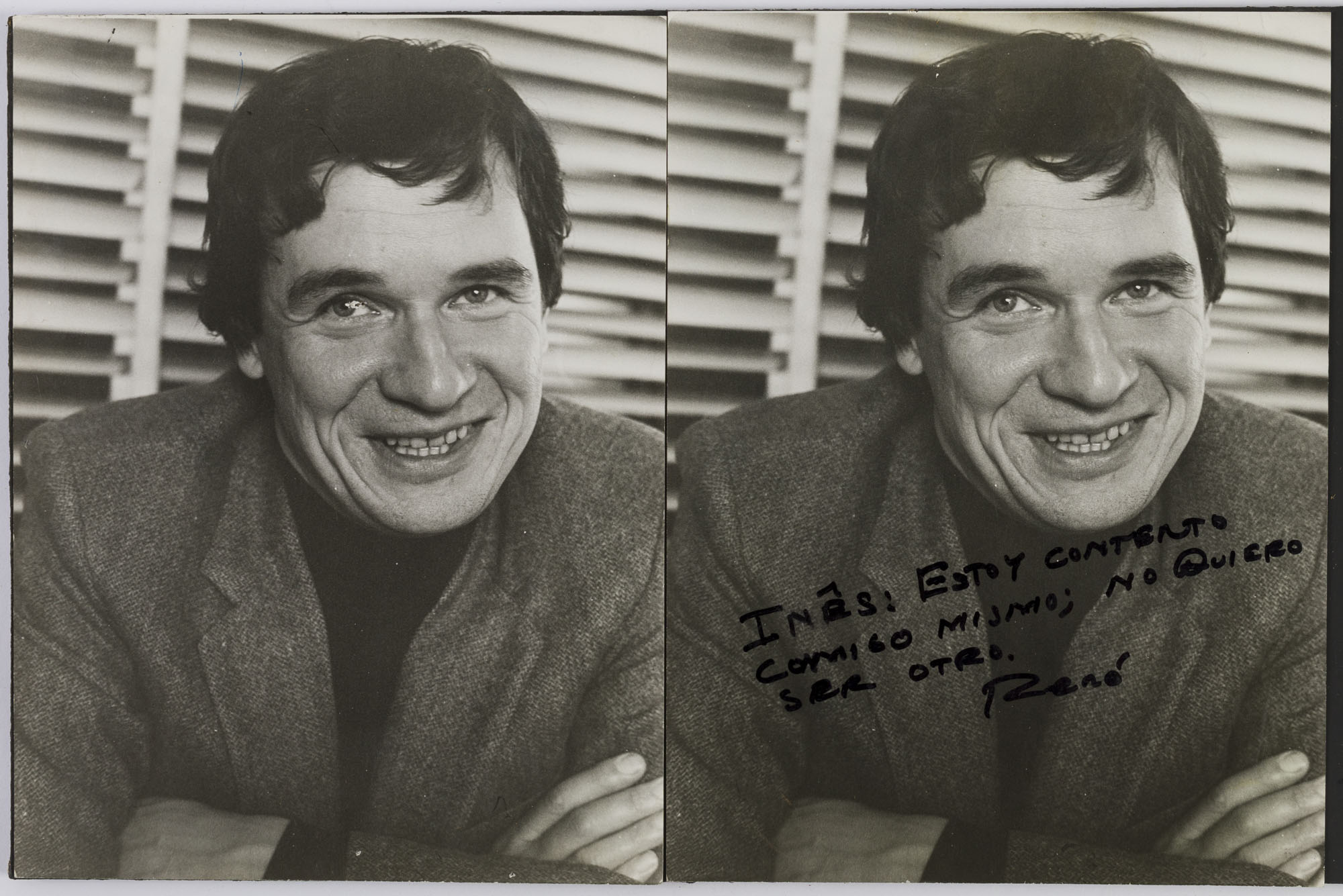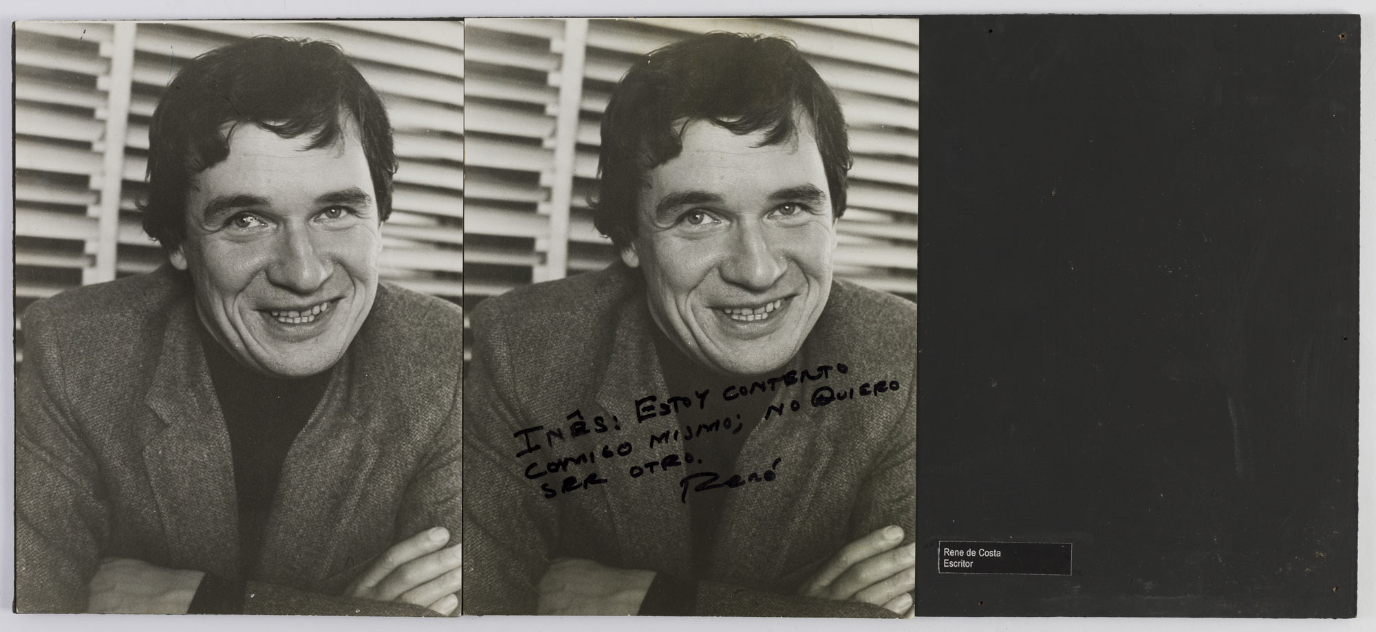 Fotografía en blanco y negro, de formato horizontal. Composición en base a díptico con dos retratos idénticos de una figura masculina de busto. El hombre viste chaqueta y polera oscura, dirigiendo la mirada al frente. En la segunda imagen se observa una intervención con palabras manuscritas en diagonal que abarcan la zona inferiori del retratado. El fondo es claro oscuro y la ilumianción es frontal.