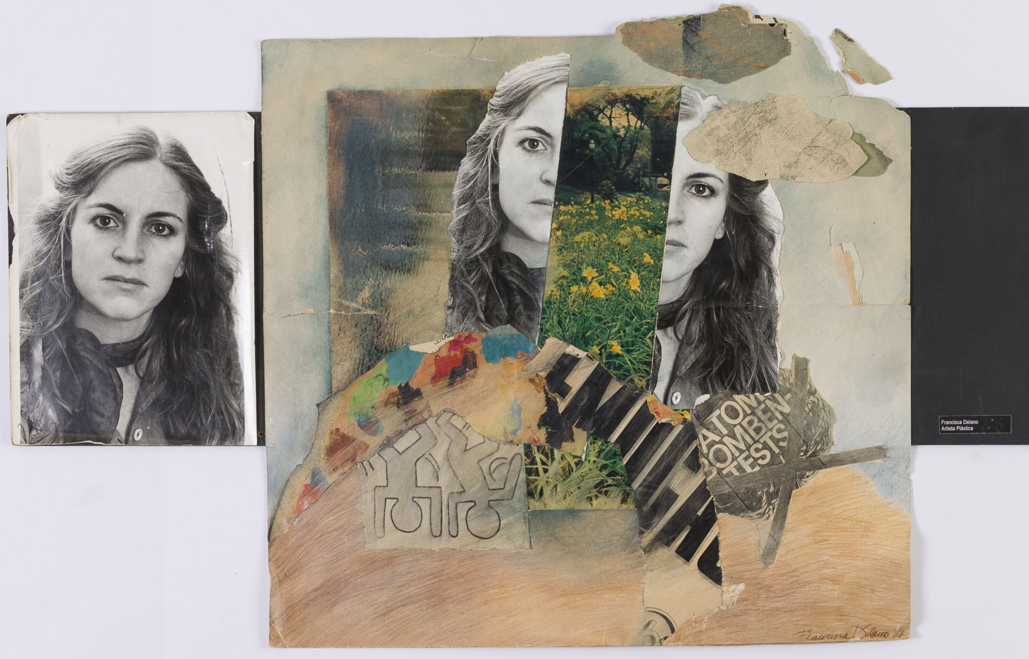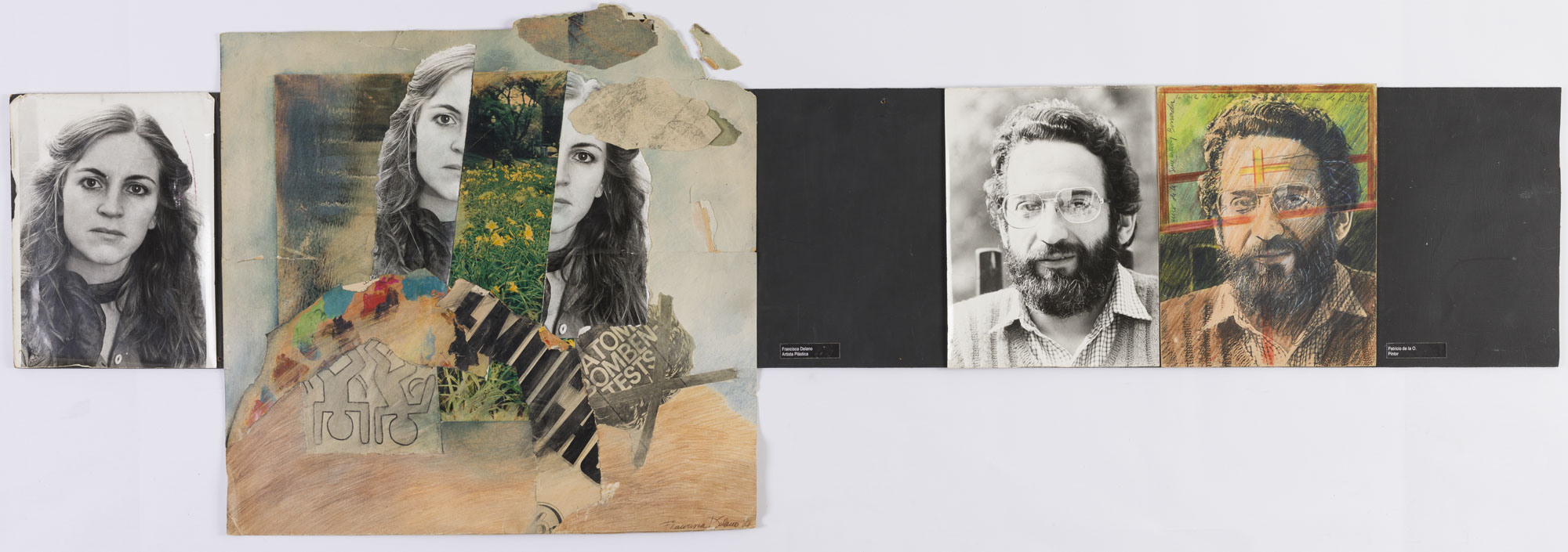 Fotografía en blanco y negro, de formato horizontal. Composición en base a díptico con dos copias de un mismo retrato de una figura femenina de busto. La mujer viste polera clara y dirige la mirada al frente. El fondo es claro y la ilumianción es frontal. En la segunda imagen se observa una inetrvención que recorta y redistrubuye la fotografía. Posicionándola sobre una superficie con manchas de variados colores y recortes.