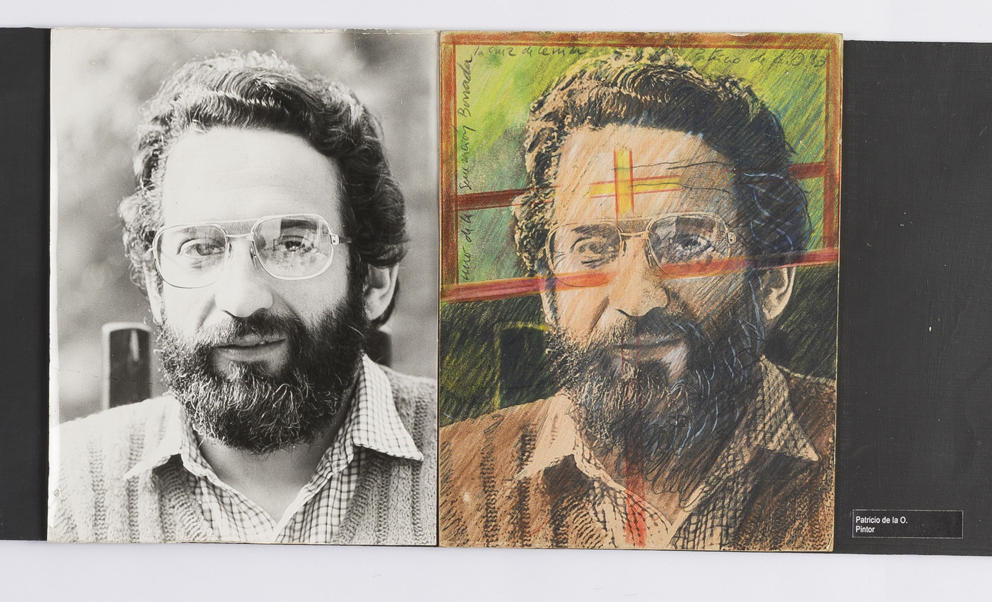 Fotografía en blanco y negro, de formato horizontal. Composición en base a díptico con dos retratos idénticos de una figura masculina de busto. El hombre viste camisa a cuadros, lentes de marco delgado y dirige la mirada al frente. En la segunda imagen se observa una intervención en pintura a lo largo de toda la fotografía, con líneas rectas distribuidas principalmente en la zona inferior, de color rojo, verde, azul y amarillo.