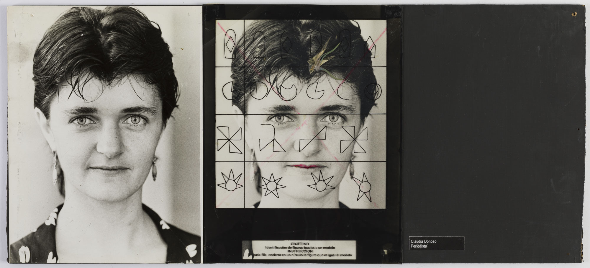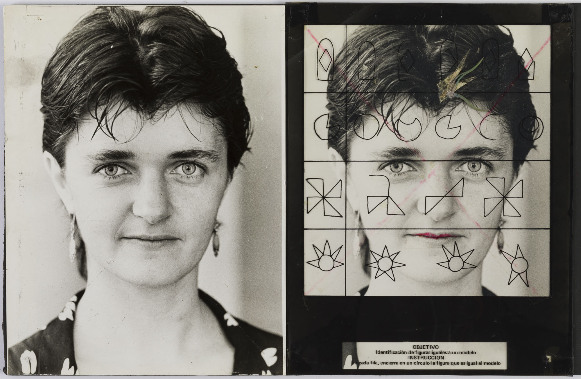 Fotografía en blanco y negro, de formato horizontal. Composición en base a díptico con dos copias idénticas de un mismo retrato de una figura femenina de busto. La mujer viste camisa con diseño de patrón, colgantes en cada oreja y dirige la mirada al frente. En la segunda imagen se observa una intervención sobre mica, la cual cubre por completo la fotografía. Esta contiene figuras variadas y un texto mecanografiado en la zona inferior. El fondo es claro y la iluminación es frontal.