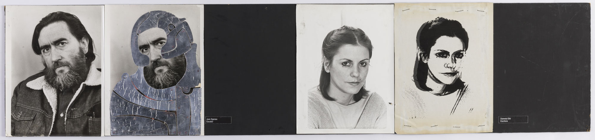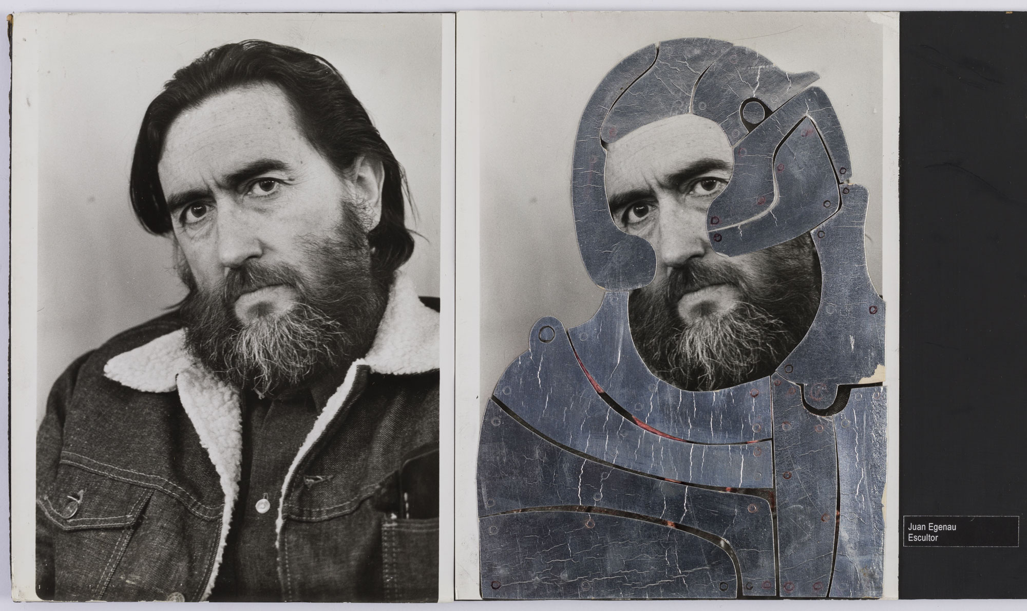Fotografía en blanco y negro, de formato horizontal. Composición en base a díptico con dos retratos idénticos de una figura masculina de busto. El hombre viste chaqueta oscura con detalles claros, camisa oscura y dirige la mirada al frente, inclinando la cabeza levemente a la izquierda. En la segunda imagen se observa una intervención en el busto y rostro con material plateado de formas variadas, dejando frente, ojos, nariz y boca al descubierto. El fondo es claro y la iluminación es frontal.