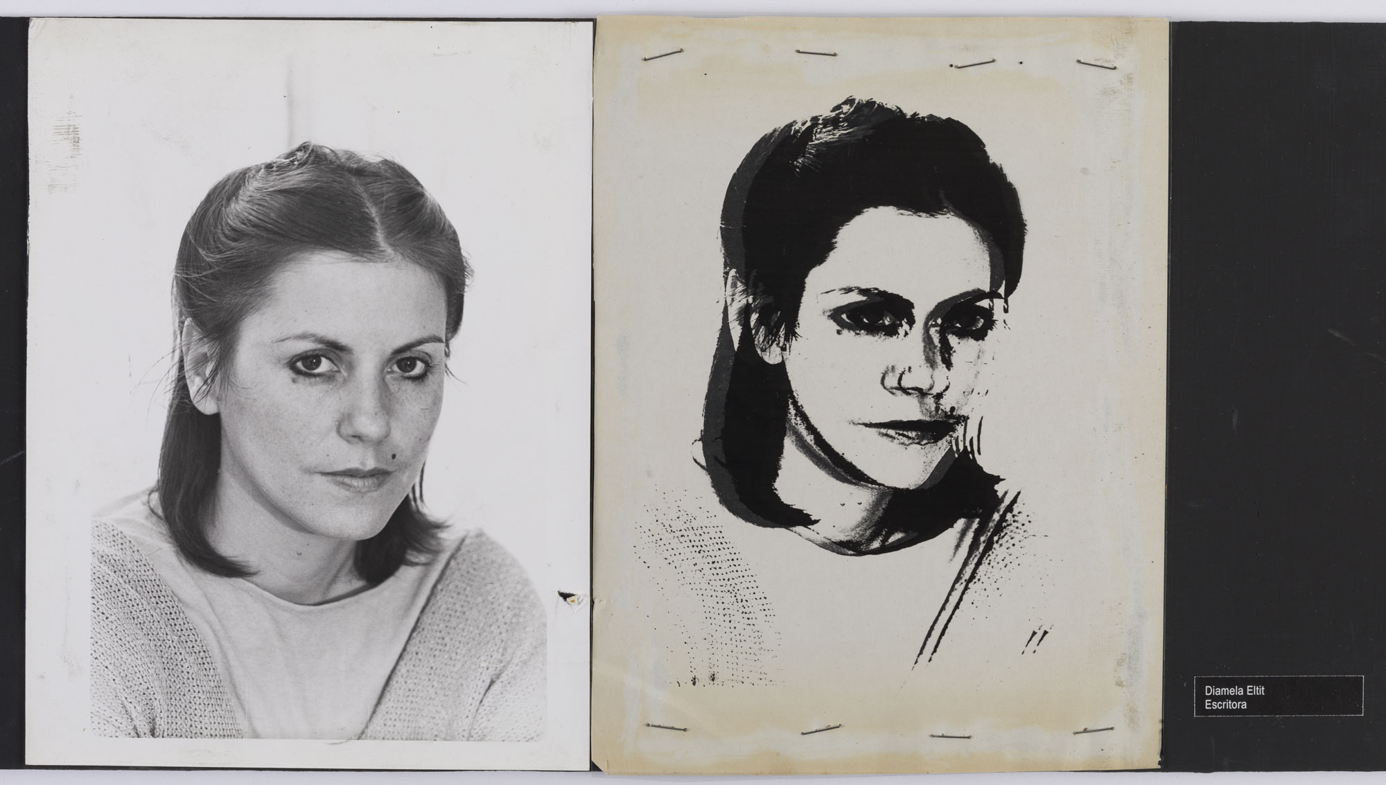 Fotografía en blanco y negro, de formato horizontal. Composición en base a díptico con dos retratos idénticos de una figura femenina de busto. La mujer viste polera clara y dirige la mirada al frente. El fondo es claro y la iluminación es frontal. En la segunda imagen observamos el retrato duplicado en negro sobre un fondo claro.