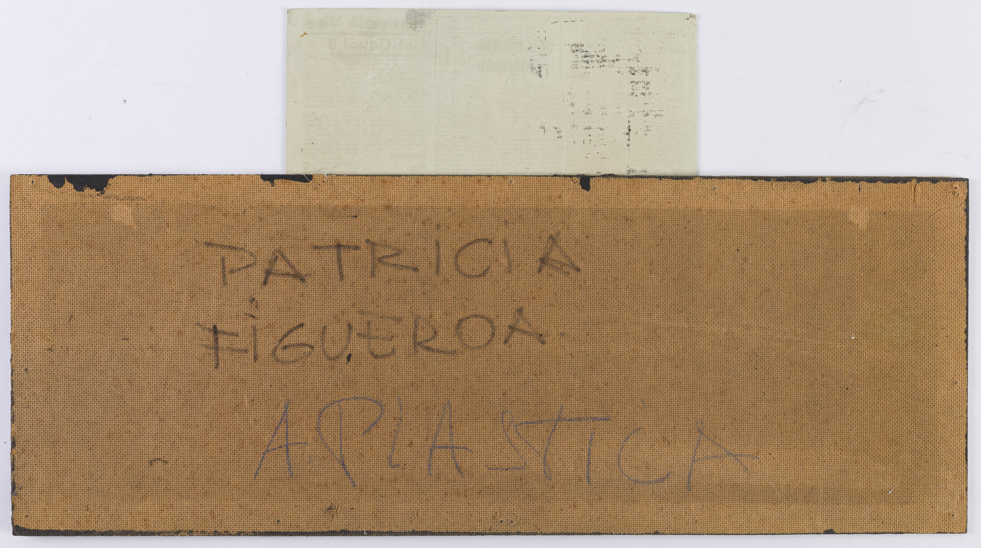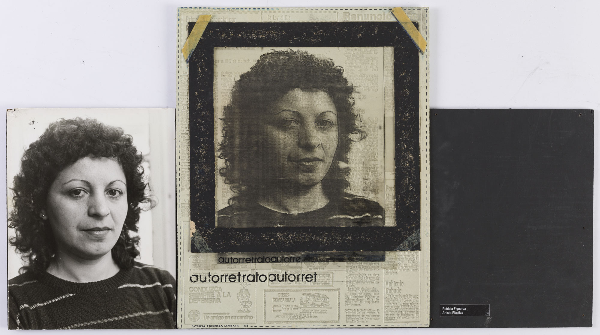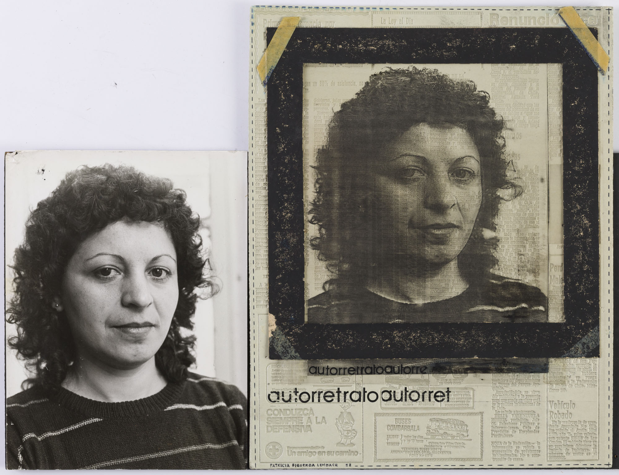 Fotografía en blanco y negro, de formato horizontal. Composición en base a díptico con dos retrato idénticos de una figura femenina de busto. La mujer viste suéter oscuro y dirige la mirada al frente. El fondo es claro y la ilumianción es frontal. En la segunda imagen se observa una intervención de la fotografía replicada en mica, la cual se posiciona sobre una superficie de diario, con textos varios. En la zona inferior izquierda palabras mecanografiadas en negro.