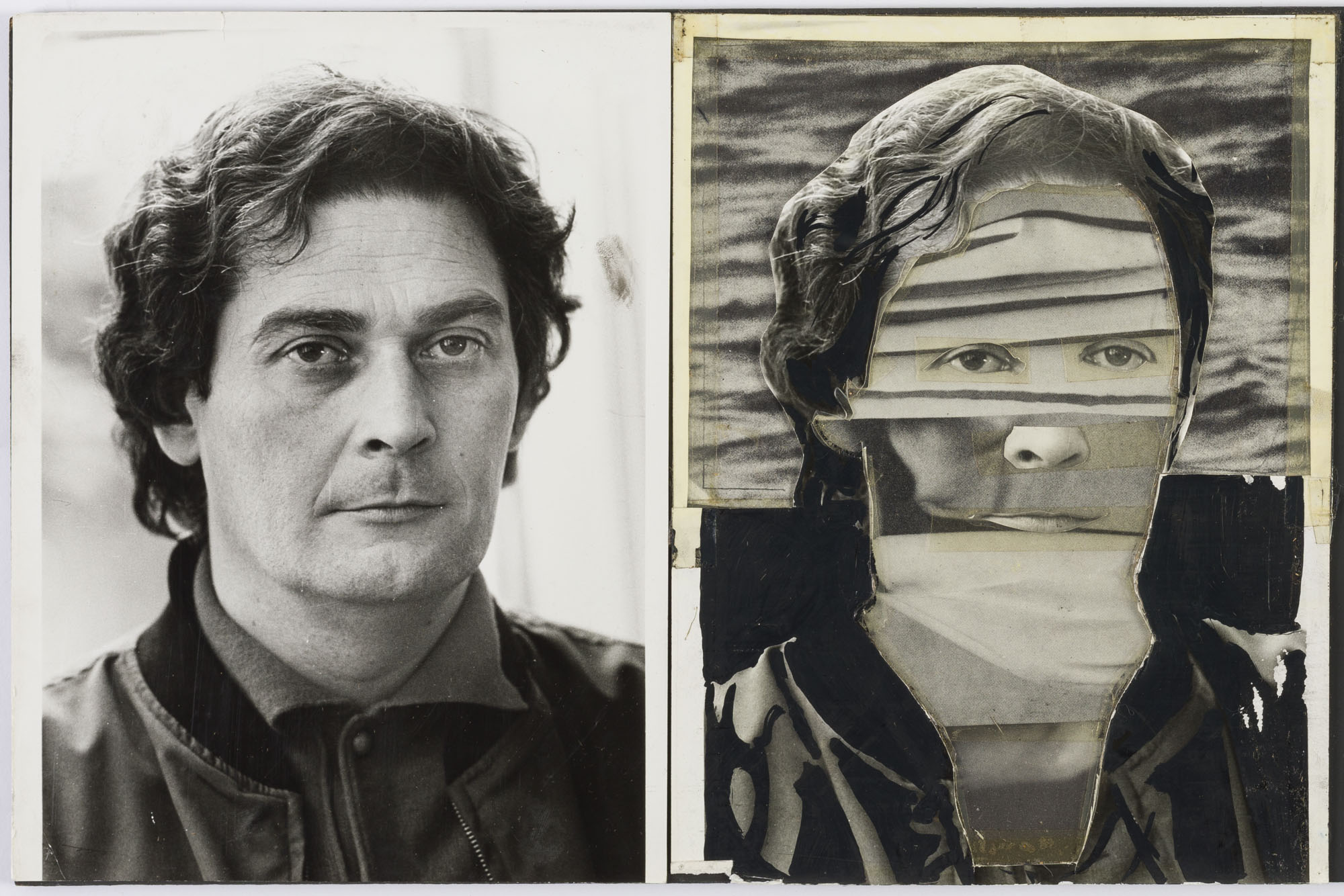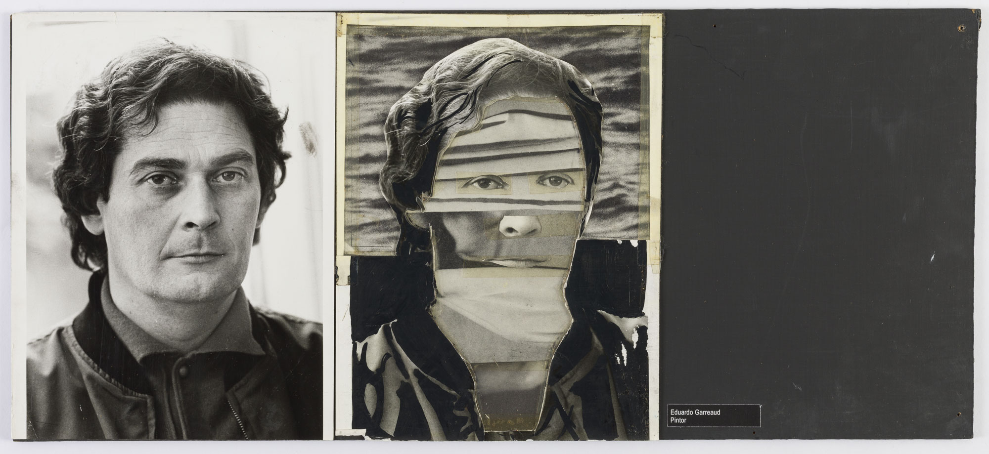 Fotografía en blanco y negro, de formato horizontal. Composición en base a díptico con dos retratos idénticos de una figura masculina de busto. El hombre viste chaqueta y camisa oscura, dirigiendo la mirada al frente. En la segunda imagen se observa una intervención al fondo, la vestimenta y al rostro con recortes en variadas tonalidades de grises. El cabello, los ojos, la naris y la boca se mantienen intactas. El fondo es claro y la iluminación es frontal.