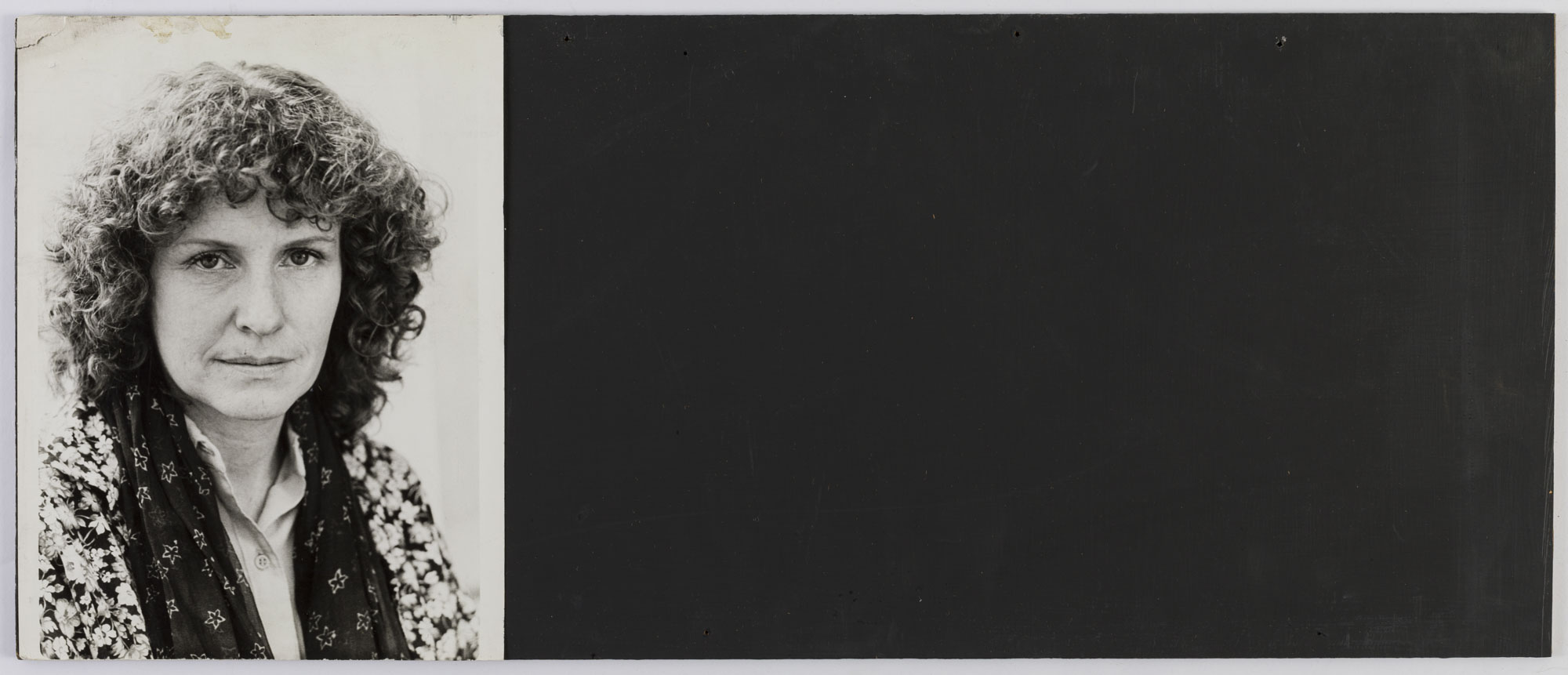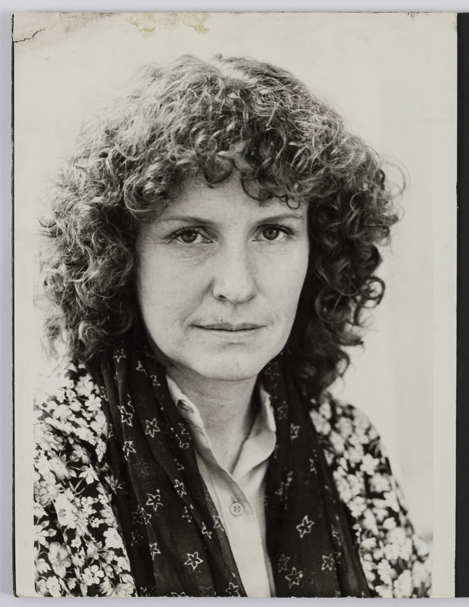 Fotografía en blanco y negro, de formato vertical. Composición en base a retrato de una figura femenina de busto. La mujer viste chaqueta de pattrón, camisa clara, pañuelo al cuello y dirige la mirada al frente. El fondo es claro y la ilumianción es frontal.