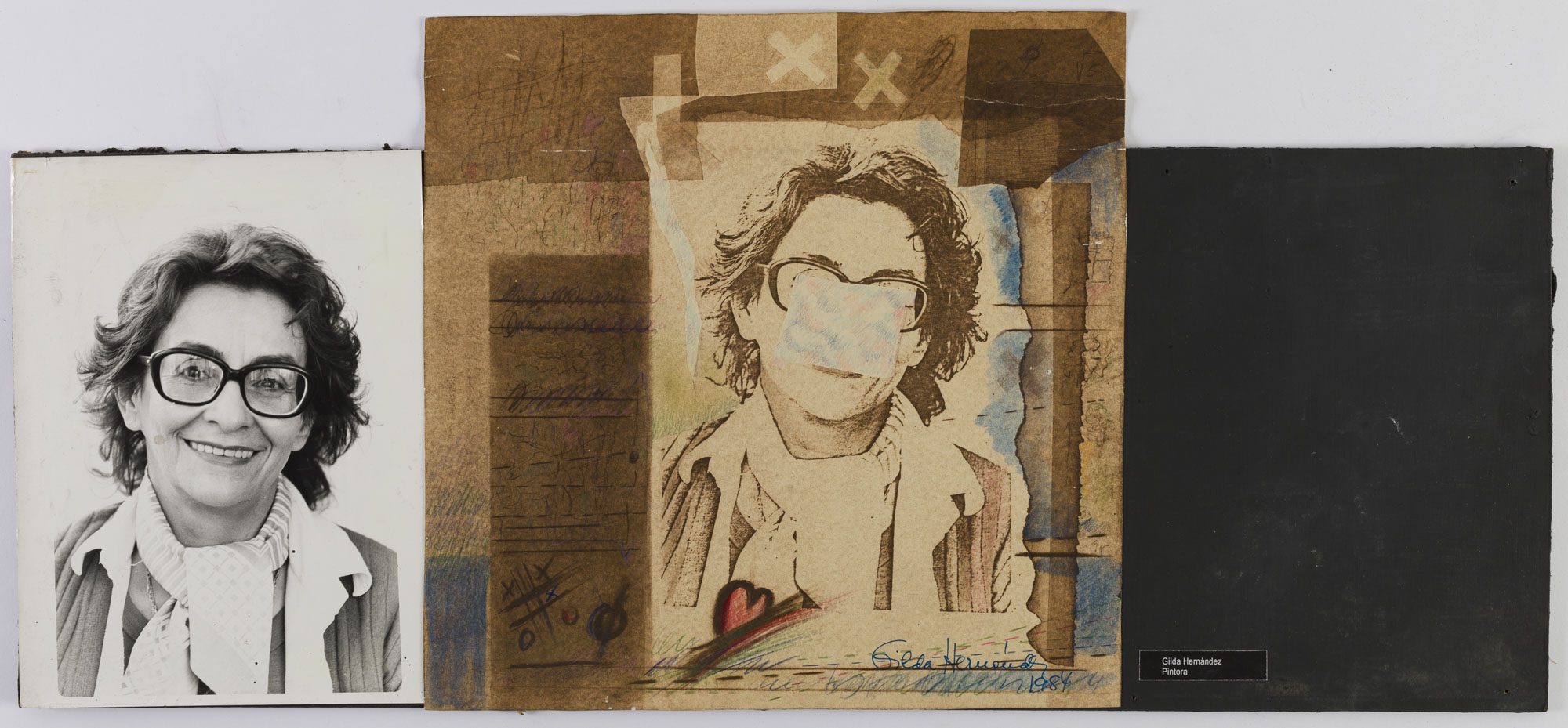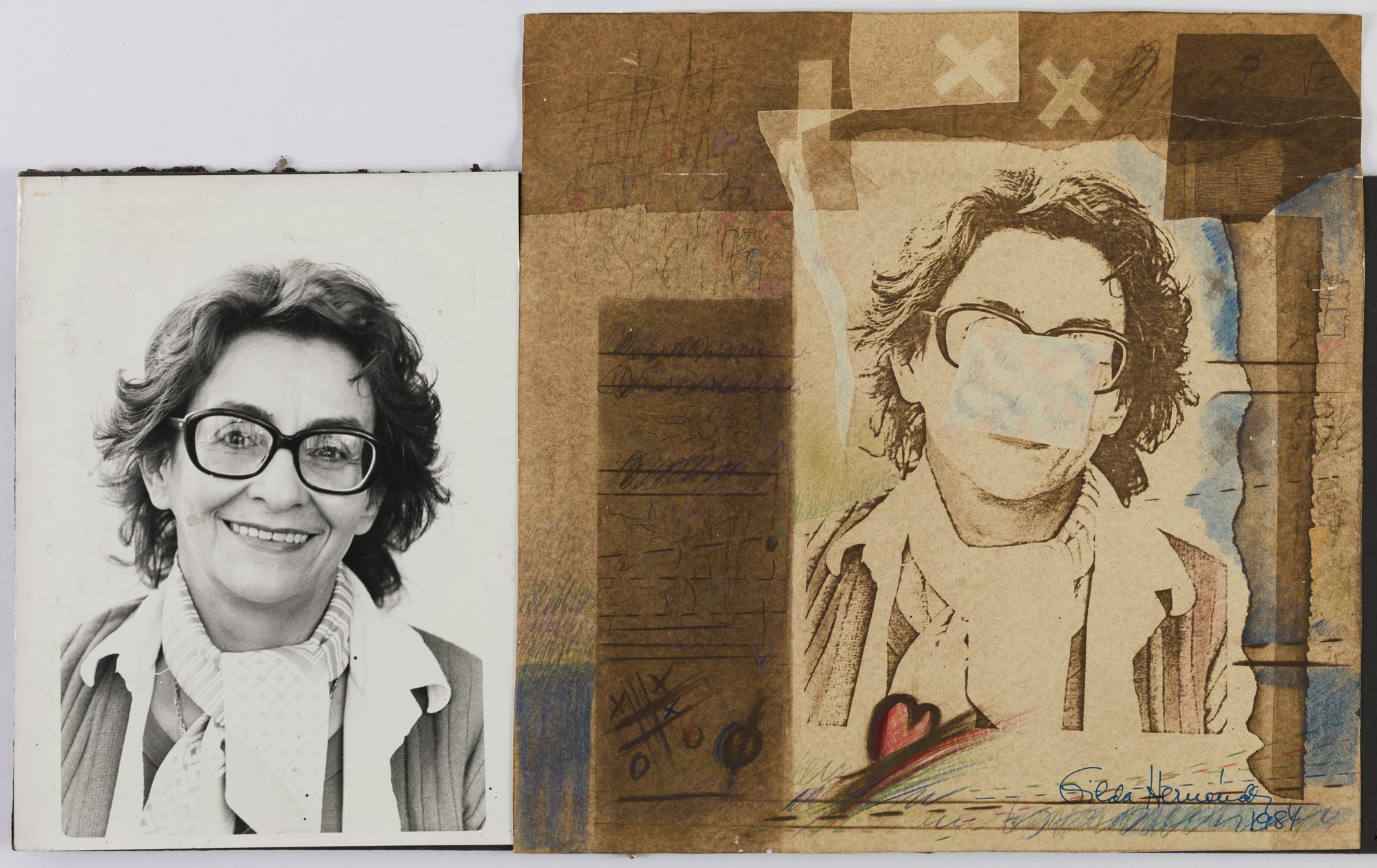 Fotografía en blanco y negro, de formato horizontal. Composición en base a díptico con dos retratos de una figura femenina de busto. La mujer viste suéter oscuro, camisa clara, pabuelo al cuello, lentes de marco grueso y dirige la mirada al frente. El fondo es claro y la ilumianción es frontal. En la segunda imagen se observa una copia del retrato sobre una superficie con formas variadas y tonalidades tierra, un parche cubre el centro del rostro.