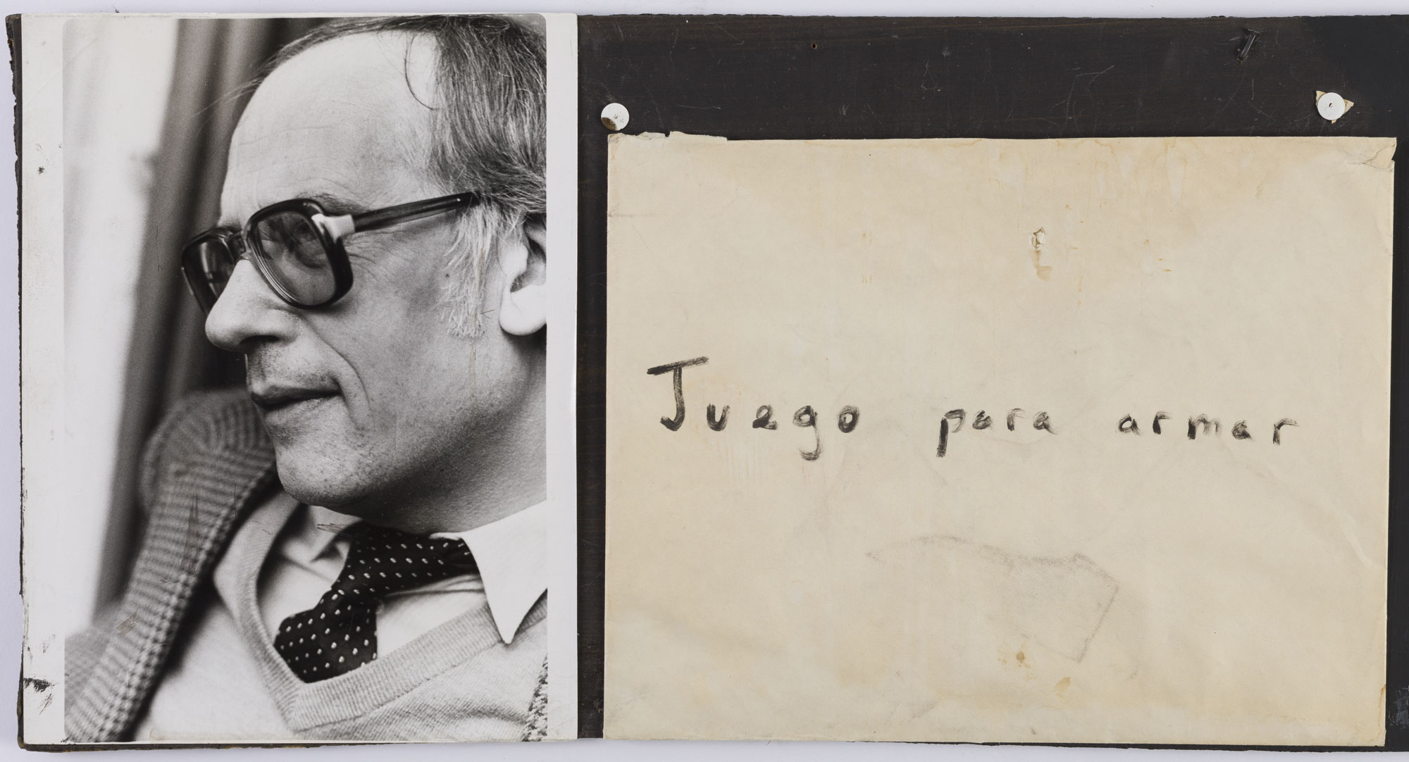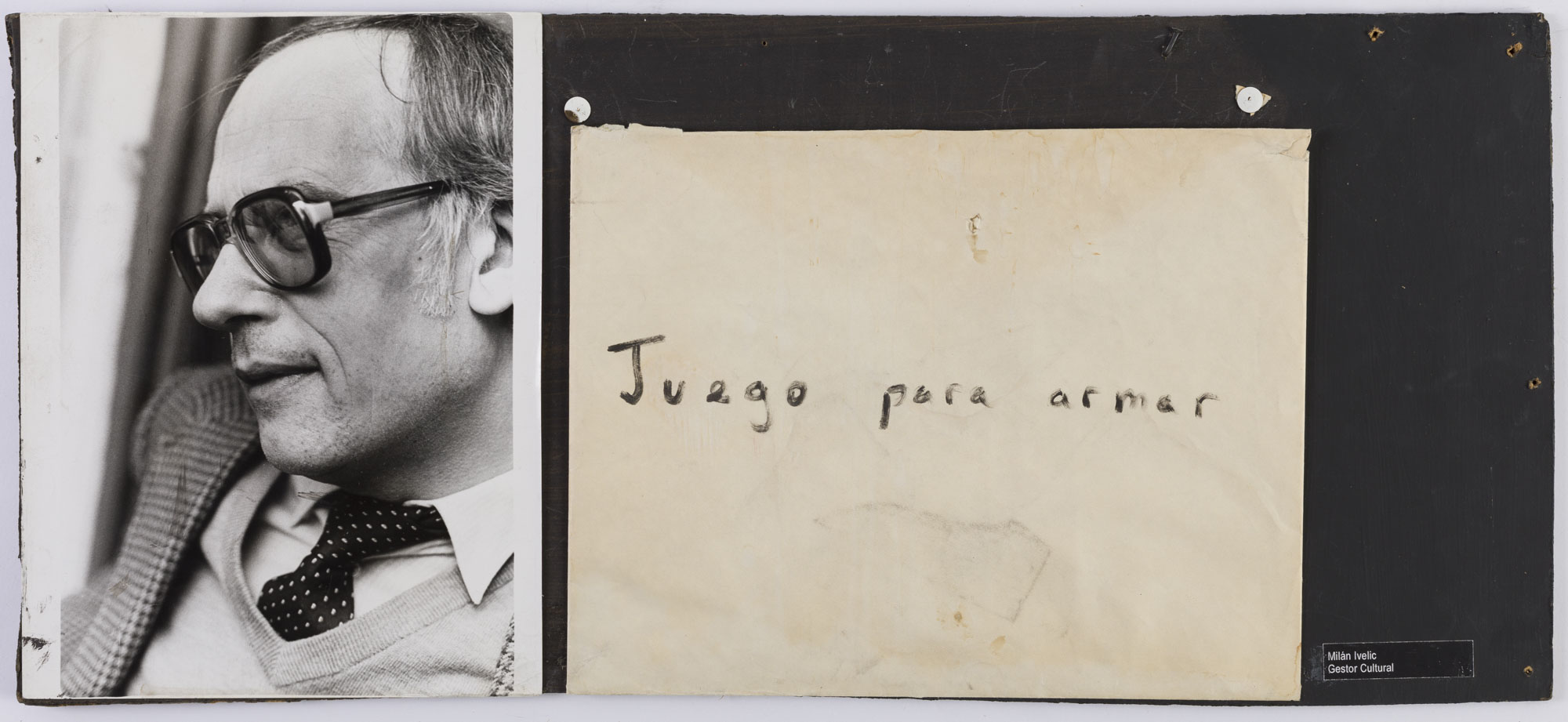 Fotografía en blanco y negro, de formato vertical. Composición en base a dos imágenes. En la primera imagen se observa un retrato de una figura masculina de perfil. El hombre viste chaqueta a cuadros, suéter semi oscuro, camisa clara, corbata oscura y lentes oscuros. El fondo es semi oscuro y la ilumianción en frontal. En la segunda imagen se observa un sobre con palabras manuscritas distribuidas horizontalmente.