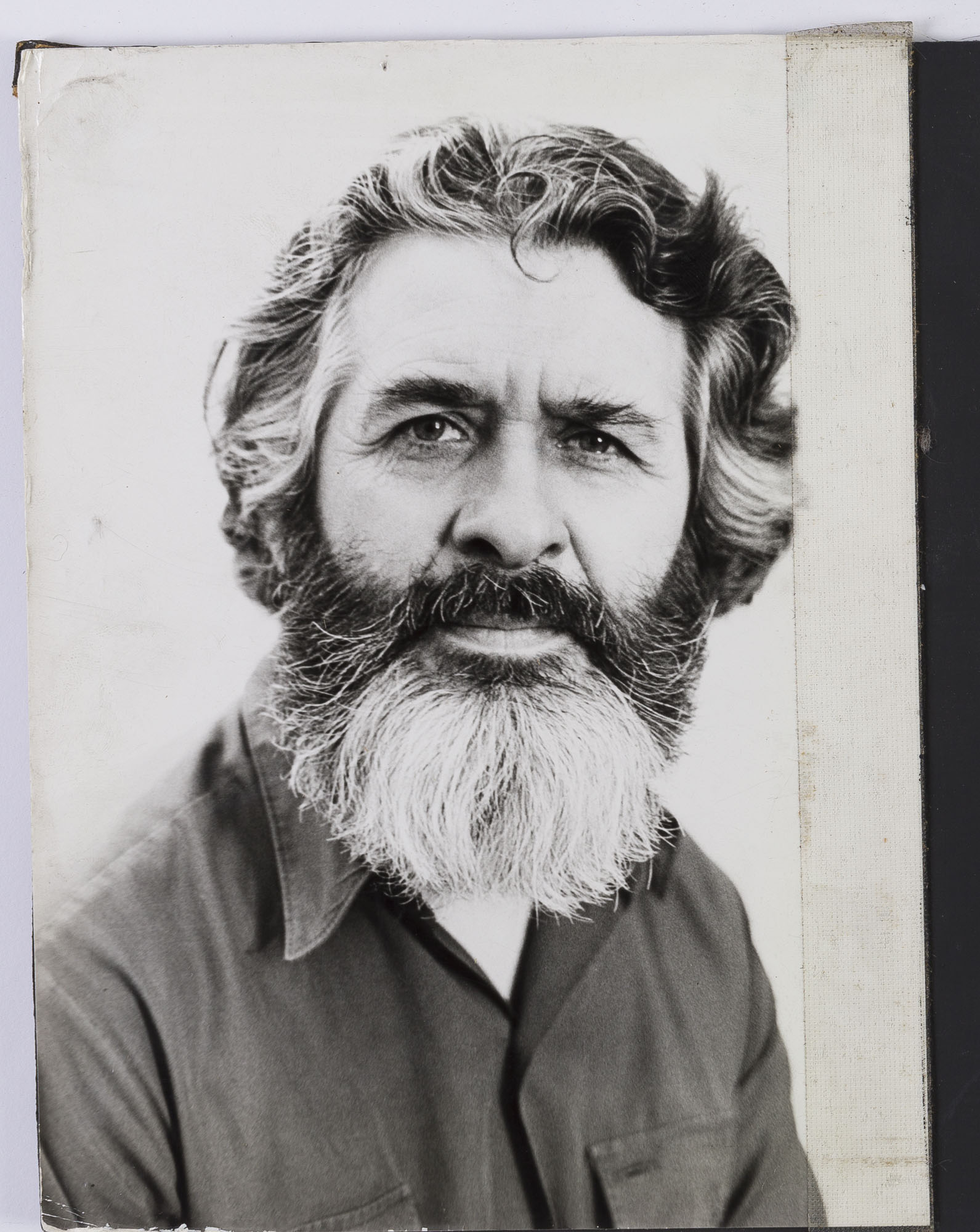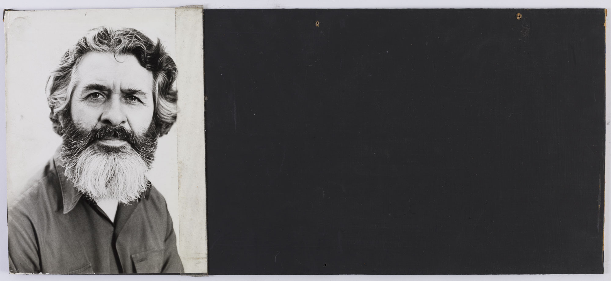 Fotografía en blanco y negro, de formato vertical. Composición en base a retrato de una figura masculina de busto. El hombre viste camisa oscura y dirige la mirada al frente. El fondo es claro y la ilumianción en frontal.