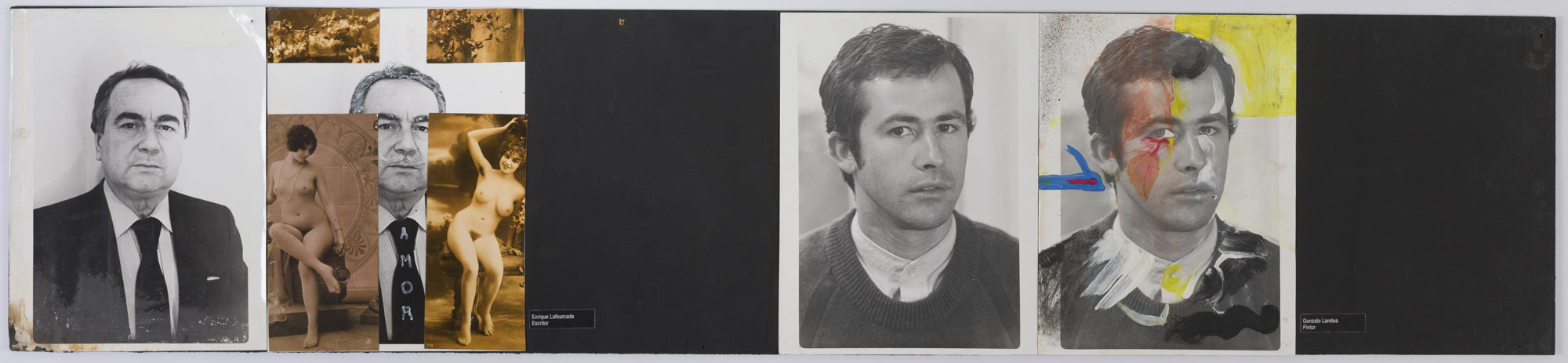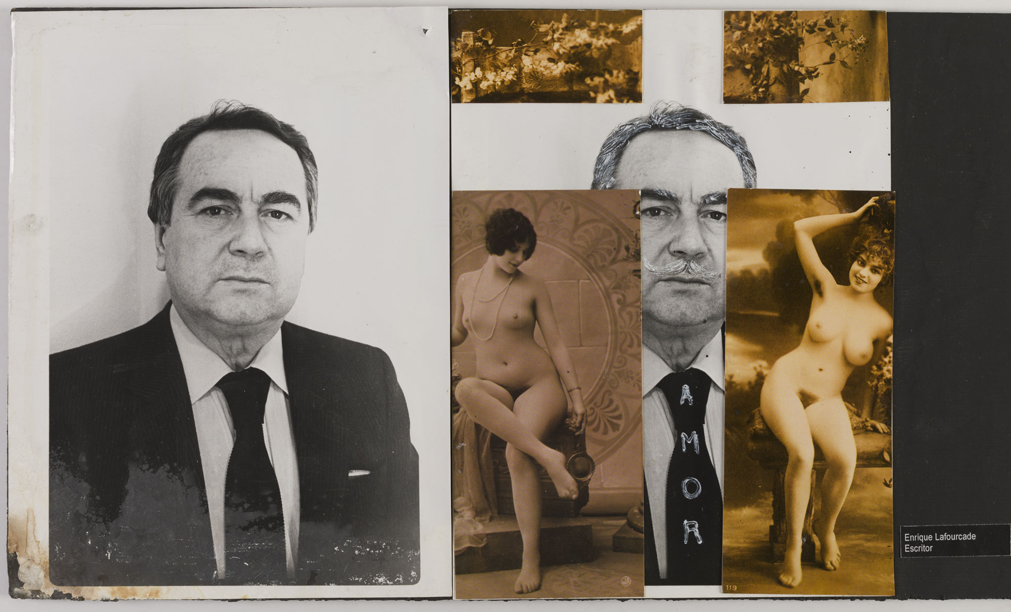 Fotografía en blanco y negro, de formato horizontal. Composición en base a díptico con dos copias del mismo retrato de una figura masculina de busto, con chaqueta oscura, camisa clara, y corbata oscura. El hombre mira al frente en ambas imágenes. En la segunda imagen se observan intervenciones en el rostro y un escrito manuscrito en la corbata, además de cuatro imágenes cubren cada una de las esquinas de la fotografía. El fondo es claro y unifrome.