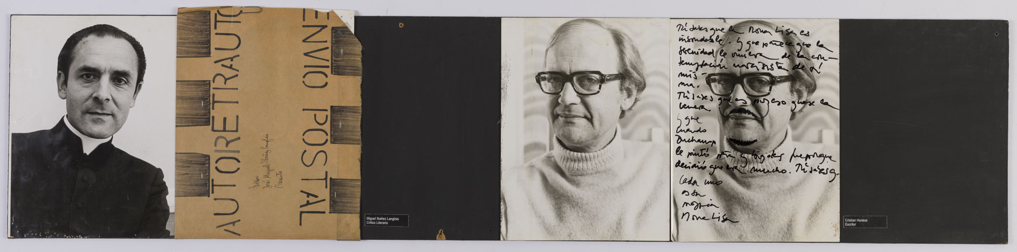 Fotografía en blanco y negro, de formato horizontal. Composición en base a díptico con dos copias idénticas de un mismo retrato de una figura masculina de busto. El hombre viste suéter de cuello alto, lentes de marco grueso y dirige la mirada al frente. En la segunda imagen se observa una intervención con letras manuscritas a lo largo de la fotografía y manchas al rededor de la boca. El fondo es claro y la ilumianción es frontal.