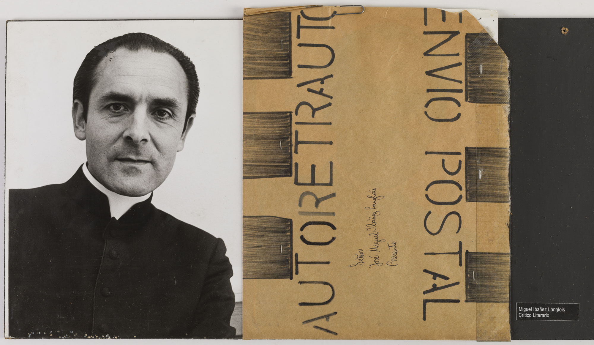 Fotografía en blanco y negro, de formato horizontal. Composición en base a díptico con dos imágenes distintas. En la primera imagen se observa el retrato de una figura masculina de busto. El hombre viste chaqueta oscura con cuello claro y dirige la mirada al frente. El fondo es claro y la ilumianción es frontal. En la segunda imagen se observa un fondo neutral con un patrón de cuadrados pintados en las orillas derecha e izquierda. Al lado de estas se encuentran palabras distribuidas verticalmente.
