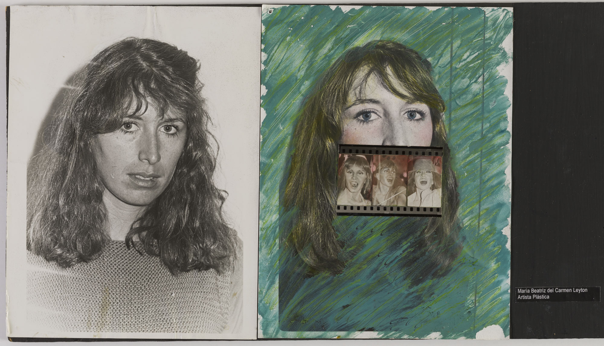 Fotografía en blanco y negro, de formato horizontal. Composición en base a díptico con dos copias idénticas de un mismo retrato de una figura femenina de busto. La mujer viste polera oscura y dirige la mirada al frente. En la segunda imagen se observa una intervención en mancha a todo el fondo y al cuello de tonalidades verde. En el centro el recorte de tres imágenes de una figura demenina. El fondo es claro y la iluminación es frontal.
