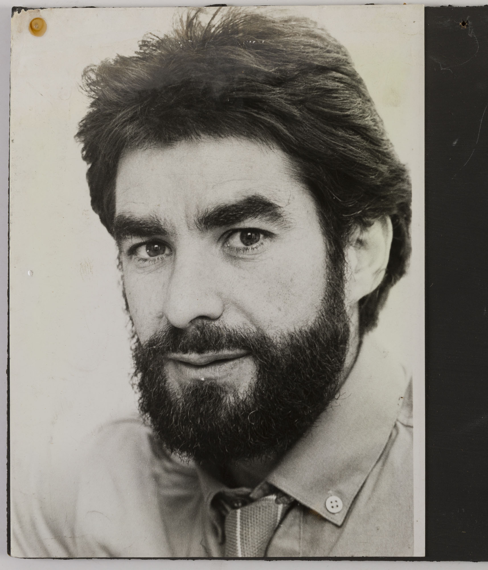 Fotografía en blanco y negro, de formato vertical. Composición en base a retrato de figura masculina de busto. El hombre viste camisa y corbata con patrón a rayas, tiene barba abundante y la mirada al frente. La iluminación es frontal y el fondo es claro.