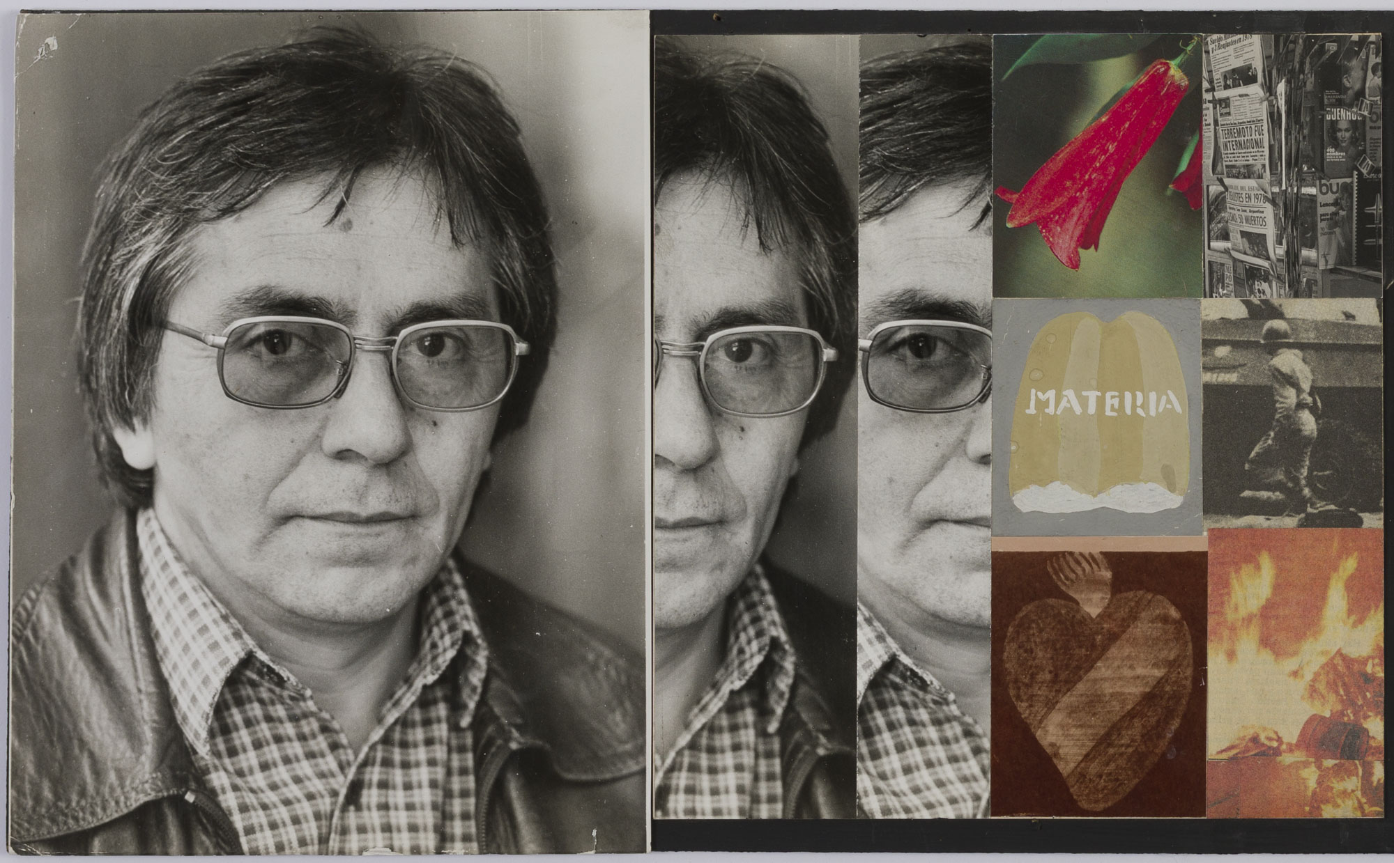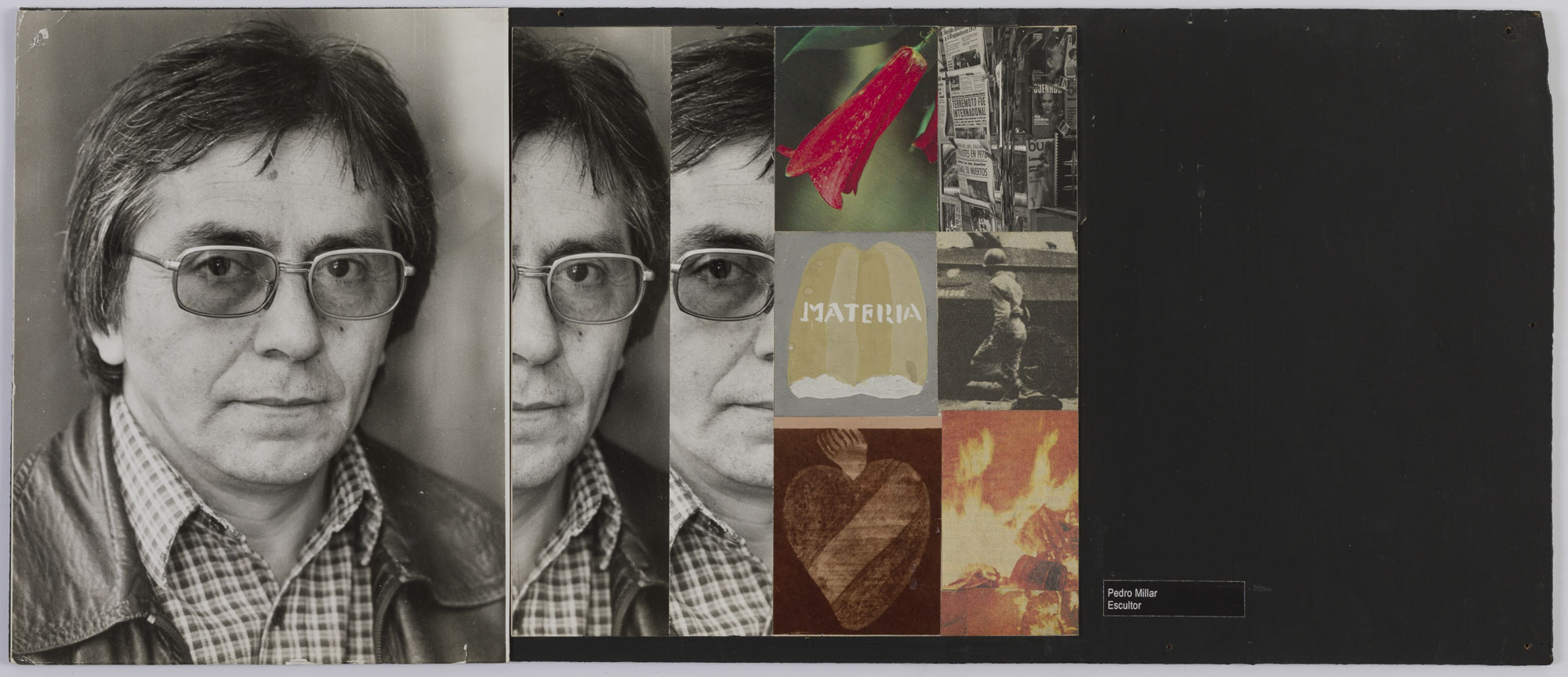 Fotografía en blanco y negro, de formato horizontal. Composición en base a dos copias del mismo retrato de una figura masculina de busto, con chaqueta oscura y camisa con patrón a cuadros. El hombre mira al frente en ambas imágenes. En la segunda imagen se observan intervenciones que recomponen el retrato y lo ajustan a variadas imágenes que cubren por completo la parte derecha. El fondo es tenue y la iluminación es frontal.