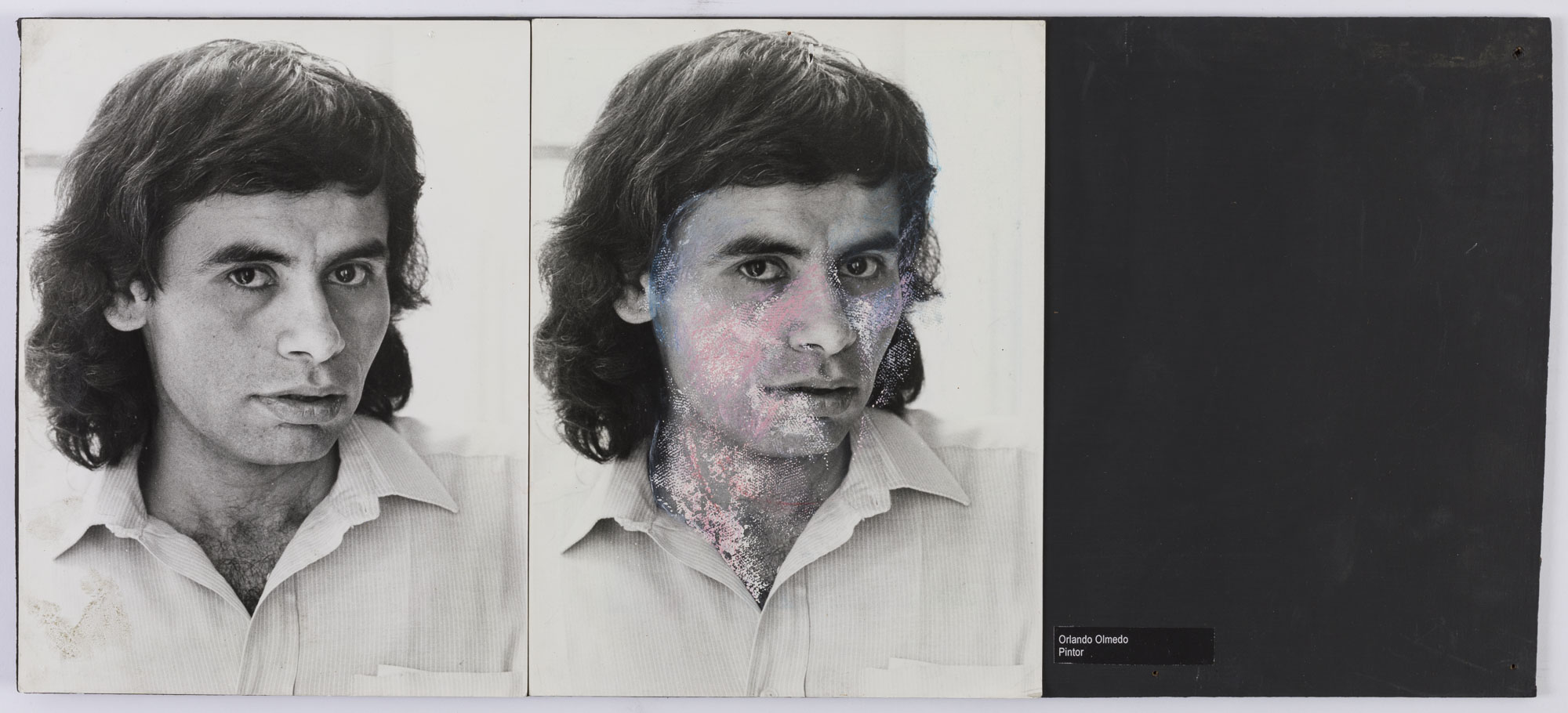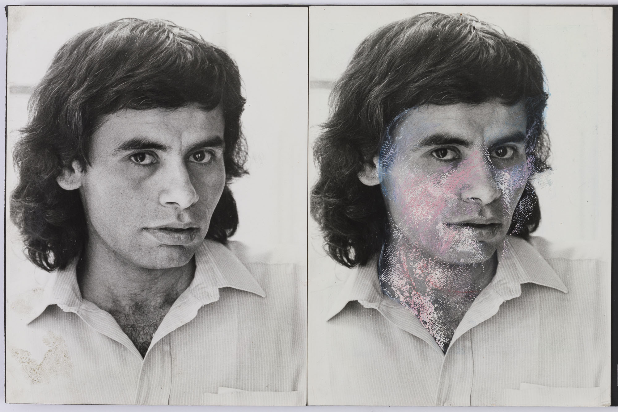 Fotografía en blanco y negro, de formato horixontal Composición en base a díptico con dos retratos idénticos de una misma figura masculina de busto. El hombre viste camisa clara de rayas y dirige la mirada al frente. En la segunda imagen se observa una intervención de mancha irregural, de color rosado, blanco, violeta y azul. El fondo es claro y la ilumianción en frontal.