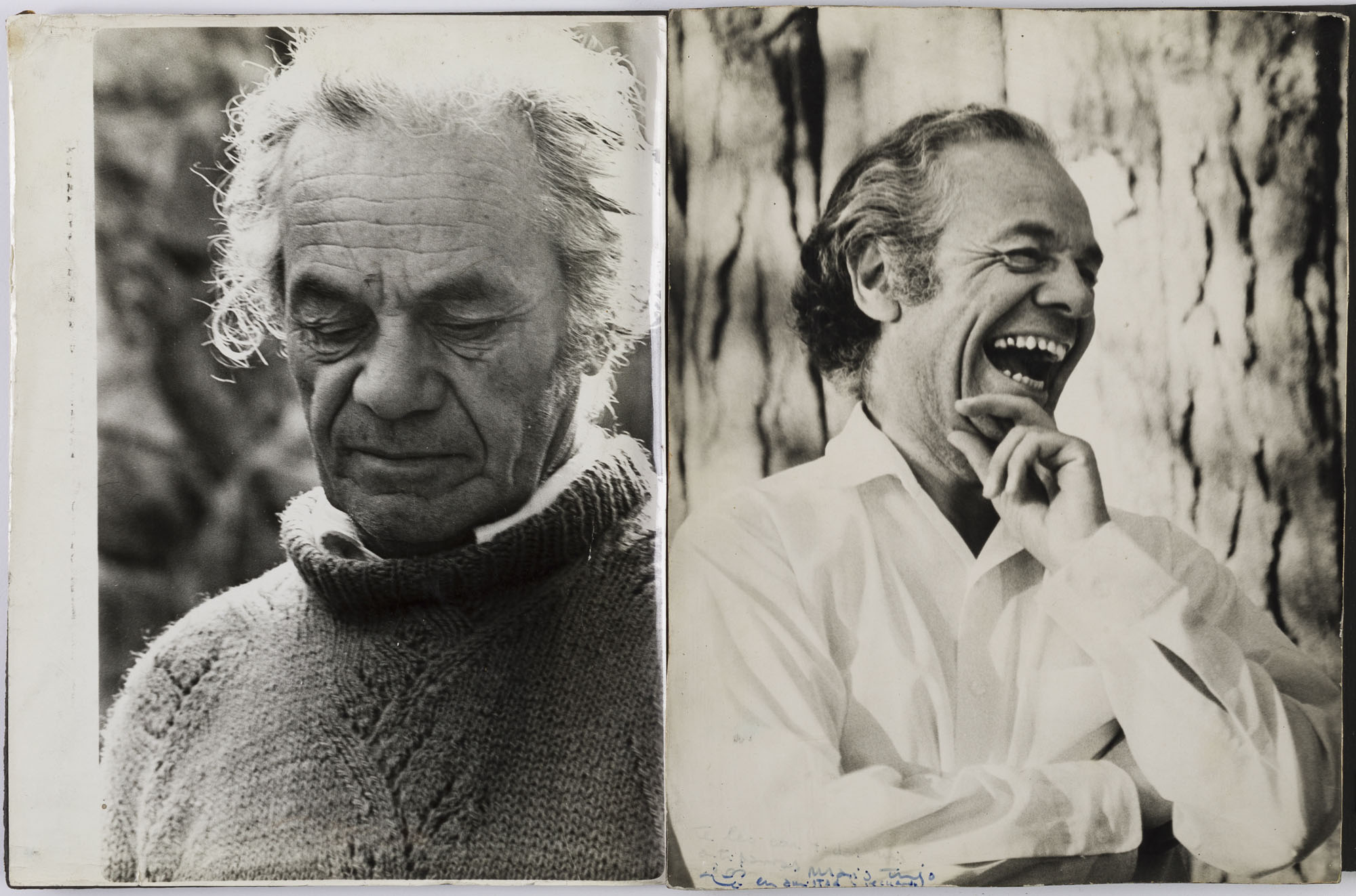 Fotografía en blanco y negro, de formato horizontal. Composición en base a díptico con dos retratos distintos de una misma figura masculina. En la primera fotografía el hombre viste suéter oscuro, camisa blanca y dirige su mirada hacia abajo. En la segunda imgen la figura viste camisa clara y dirige su mirada al costado. El fondo es sombrío y la iluminación es frontal.