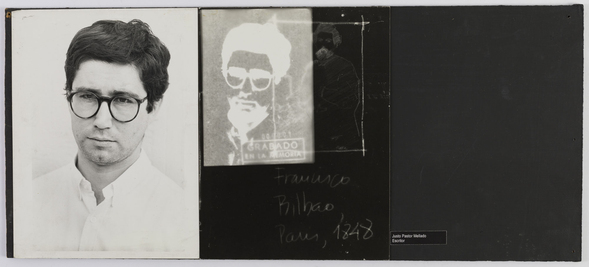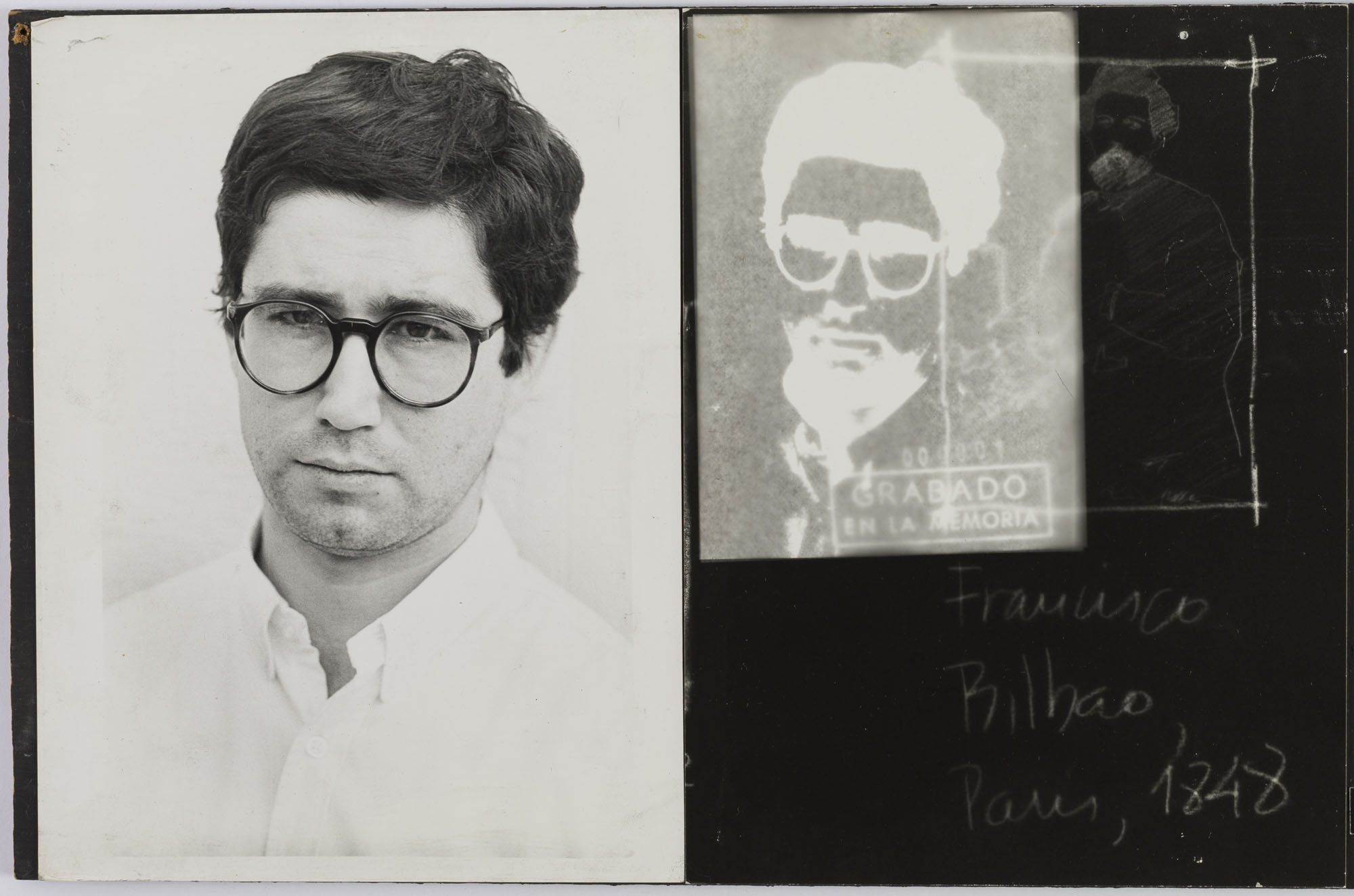 Fotografía en blanco y negro, de formato horizontal. Composición en base a díptico con dos imágenes distintas de un mismo retrato. En la primera imagen se observa el retrato de una figura masculina de busto. El hombre viste camisa clara, lentes de marco socuro y dirige la mirada al frente. El fondo es claro y la ilumianción es frontal. En la segunda imagen se observa una intervención al retrato, replicada en mica, junto a palabras en manuscrito, todo de color blanco.