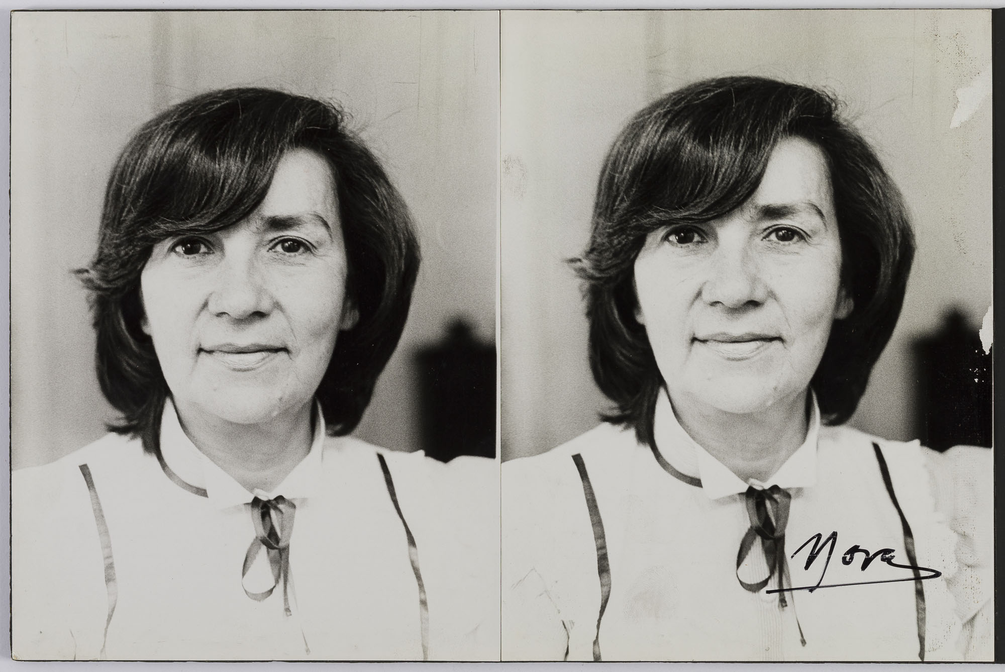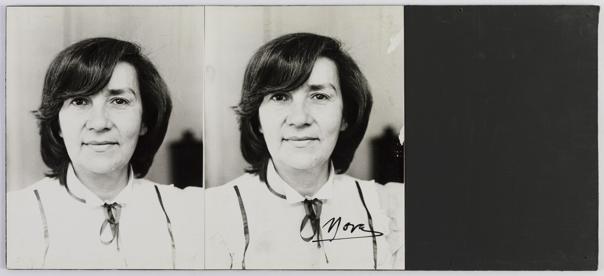 Fotografía en blanco y negro, de formato horizontal. Composición en base a díptico con dos retratos idénticos de una figura femenina de busto. La mujer viste camisa clara con detalles oscuros y dirige la mirada al frente. En la segunda imagen se observa una intervención manuscrita en la zona inferior derecha. El fondo es tenue y la iluminación es frontal.