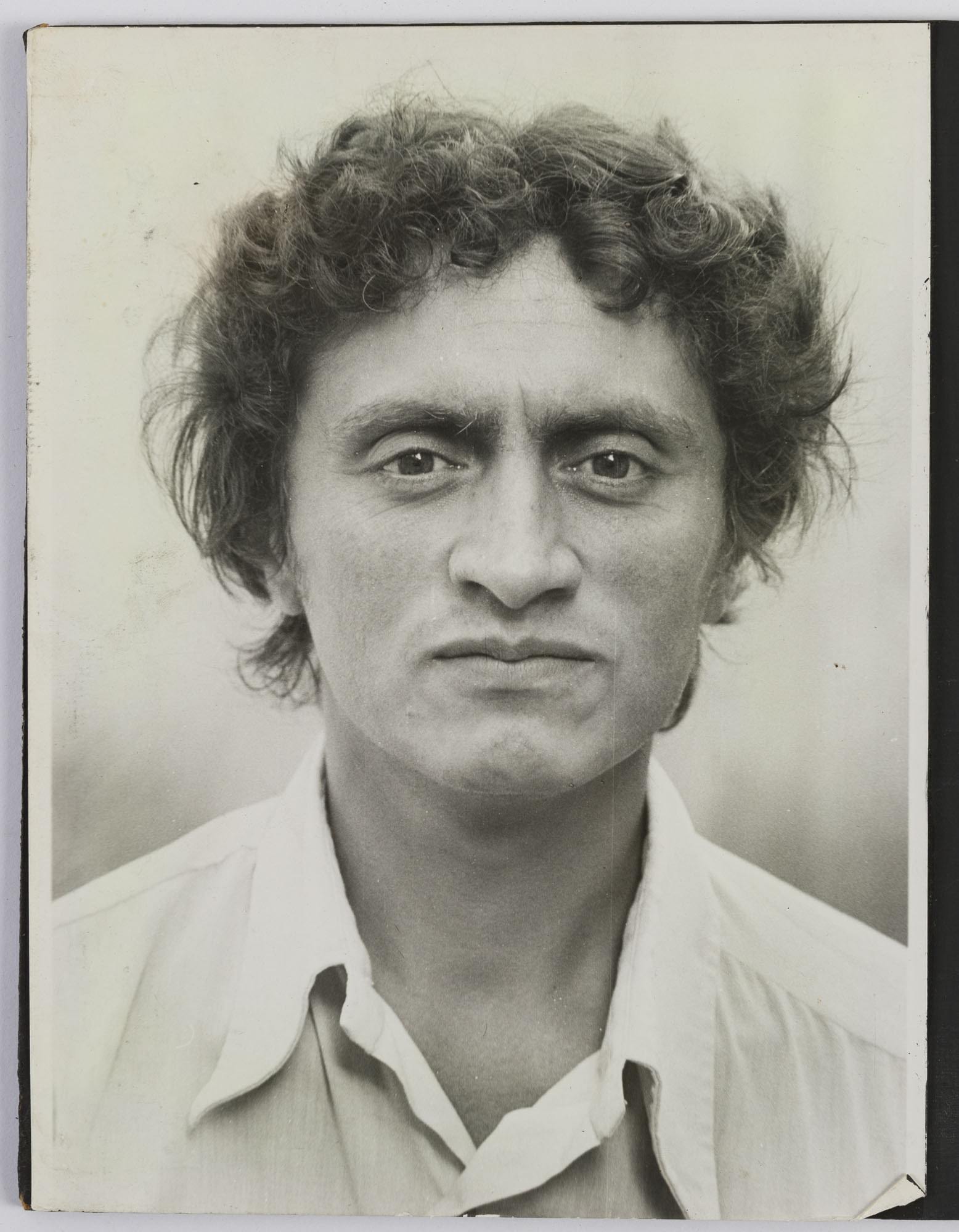 Fotografía en blanco y negro, de formato vertical. Composición en base a retrato de figura masculina de busto. El hombre viste camisa clara y dirige la mirada al frente. El fondo es claro y la iluminación es tenue.