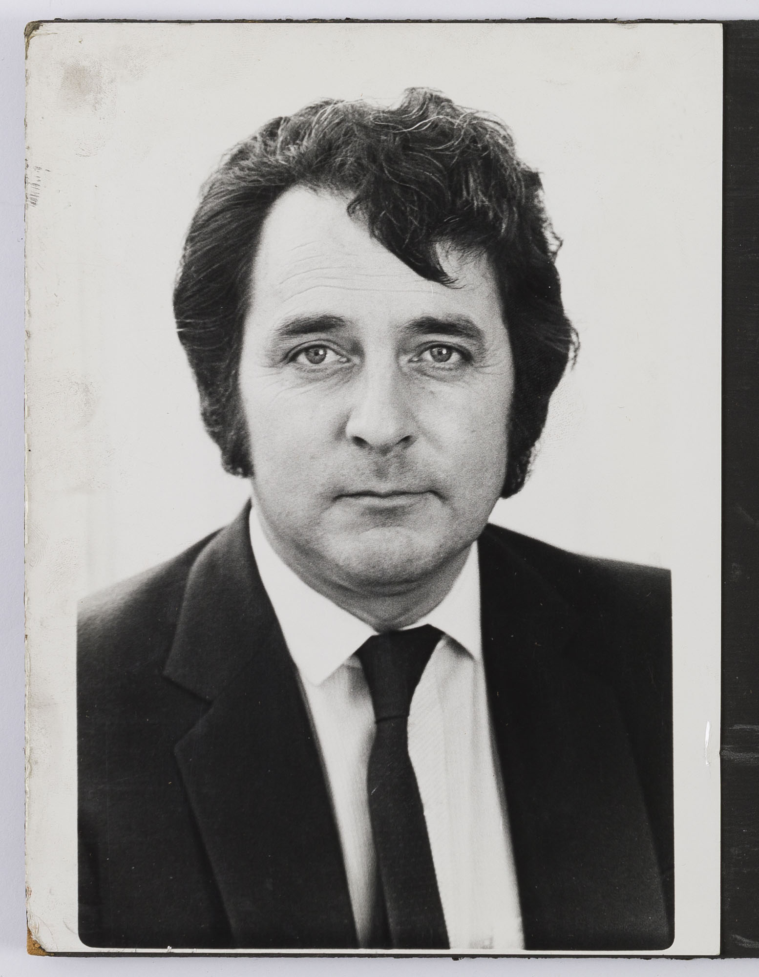 Fotografía en blanco y negro, de composición vertical. Composición en base a retrato de una figura masculina de busto. El hombre viste chaqueta oscura, camisa clara, corbata oscura y dirige la mirada al frente. El fondo es claro y la iluminación es frontal.