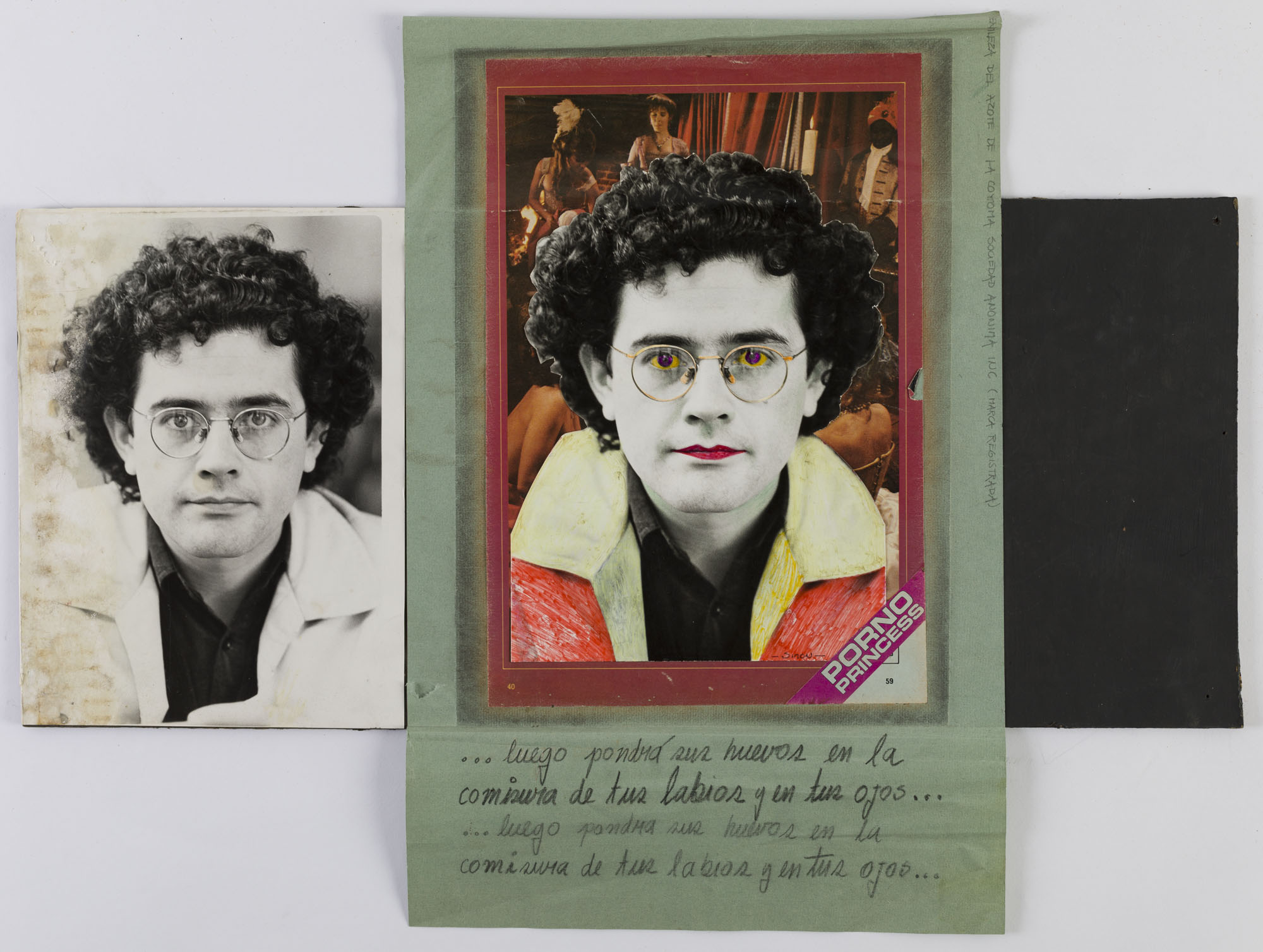 Fotografía en blanco y negro, de formato horizontal. Composición en base a díptico con dos retrato idénticos de una figura masculina de busto. El hombre viste chaqueta clara, camisa oscura, lentes de marco delgado y dirige la mirada al frente. El fondo es tenue y la ilumianción es frontal. En la segunda imagen se observa la fotografía intervenida sobre un papel verde que excede el soporte con palabras manuscritas en negro. El retratado está rodeado por figuras variadas de color rojo, marrón y amarillo.