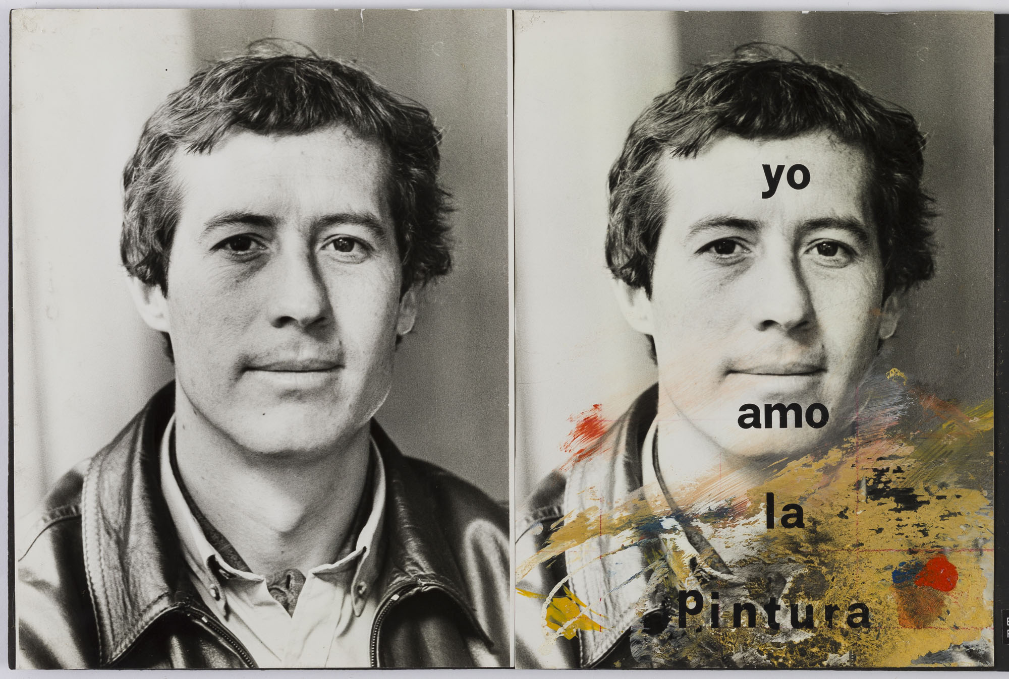 Fotografía en blanco y negro, de formato horizontal. Composición en base a díptico con dos retratos idénticos de una figura masculina de busto. El hombre viste chaqueta oscura, camisa clara y dirige la mirada al frente. En la segunda imagen se observa una intervención irregural en la zona inferior derecha de color amarillo, rojo, narajo y azul. Se distribuyen palabras en el centro de la imagen de forma horizontal, de color negro. El fondo es semi oscuro y la iluminación es frontal.