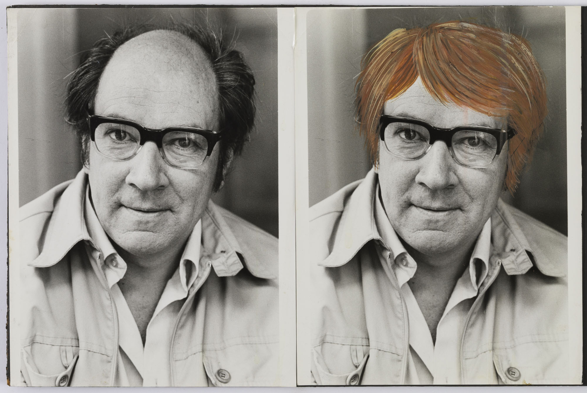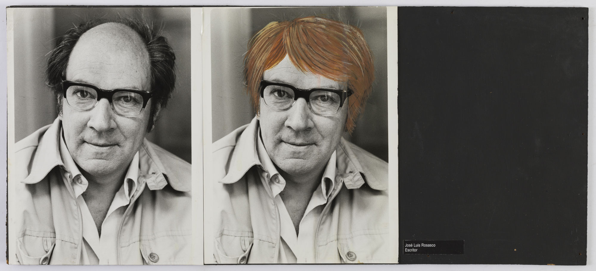 Fotografía en blanco y negro, de formato horizontal. Composición en base a díptico con dos retratos idénticos intervenidos de una figura masculina de busto. El hombre viste chaqueta oscura, camisa clara, lentes de marco grueso y dirige la mirada al frente. En la segunda imagen se observa una intervención en pintura sobre el cabello de color marrón, amarillo y blanco. El fondo es sombrío y la iluminación es frontal.