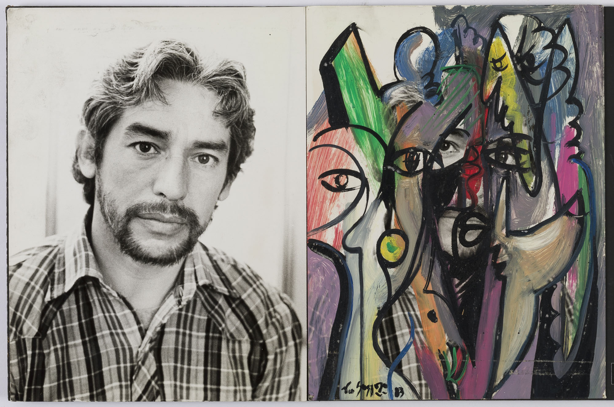 Fotografía en blanco y negro, de formato horizontal. Composición en base a díptico con dos retratos idénticos de una figura masculina de busto. El hombre viste camisa a rayas y dirige la mirada al frente. En la segunda imagen se observa una intervención en pintura de color negro, verde, azul, violeta, rojo y gris. La iluminación es frontal y el fondo es claro.