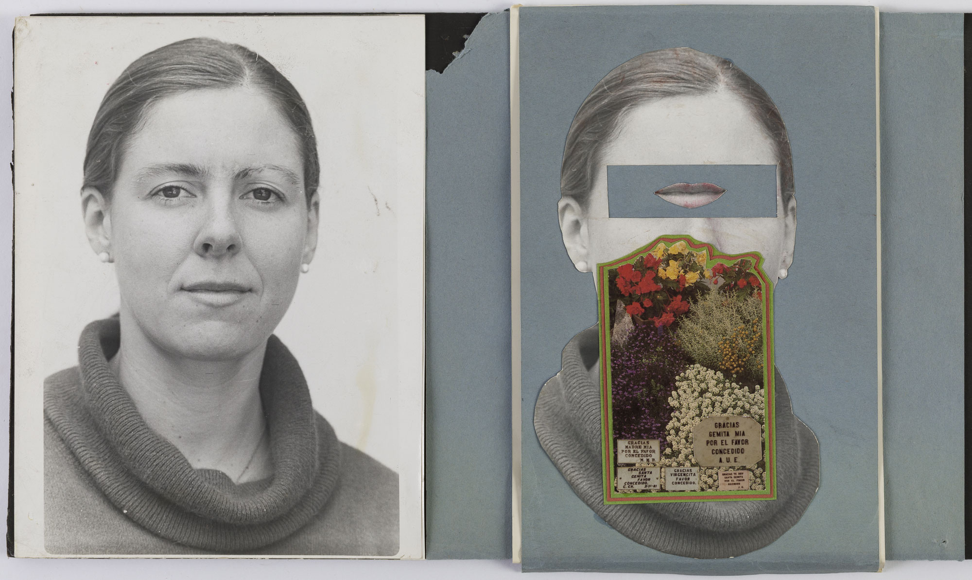 Fotografía en blanco y negro, de formato horizontal. Composición en base a díptico con dos retratos idénticos de una figura femenina de busto. La mujer viste suéter oscuro, con cuello alto, aros de perla y dirige la mirada al frente. En la segunda imagen se observa una intervención de recortes variados que cambian el fondo, los ojos, la zona inferior del busto y el rostro de color rojo, verde, violera, amarillo y blanco. Con cuadrados de texto en negro.