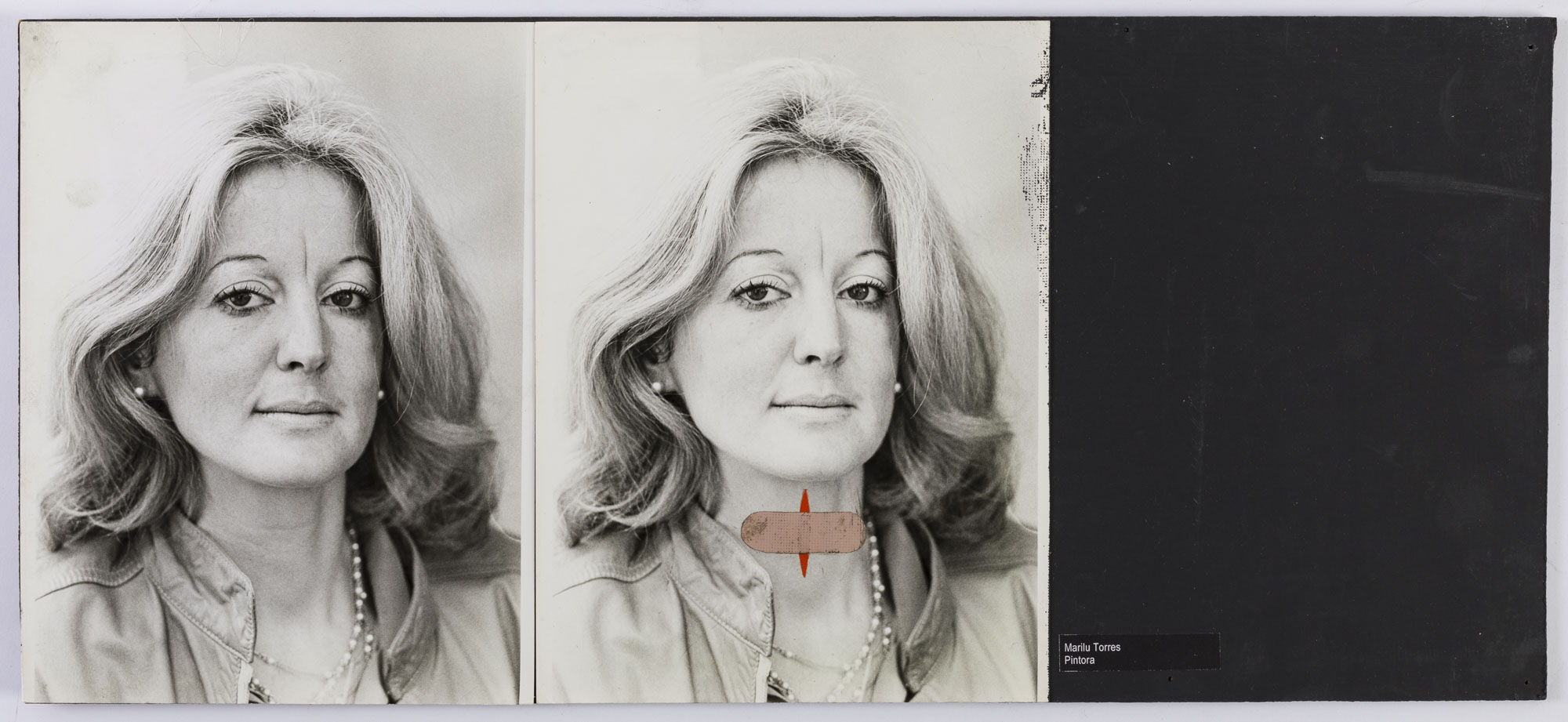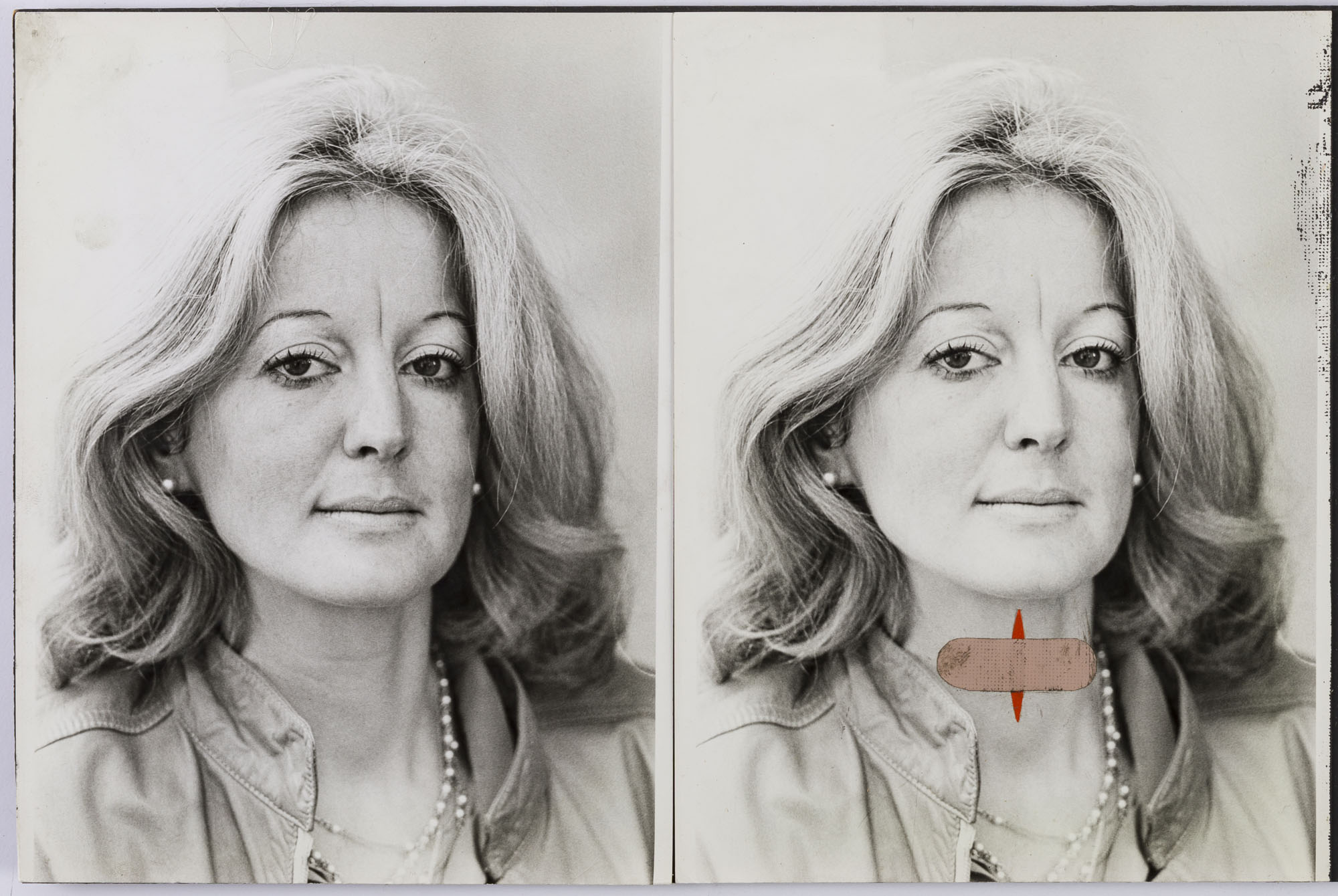 Fotografía en blanco y negro, de formato horizontal. Composición en base a díptico con dos retratos idénticos de una figura femenina de busto. La mujer viste chaqueta oscura, collares varios y dirige la mirada al frente. En la segunda imagen se observa una intervención en el centro del cuello de la retratada, con una figura vertical de color rojo, atravesada por un parche de tonalidad clara. La iluminación es frontal y el fondo es claro.