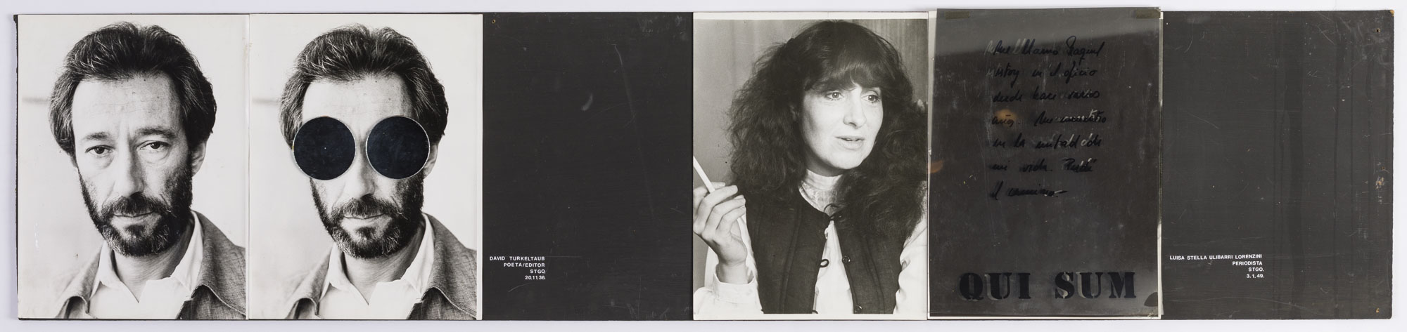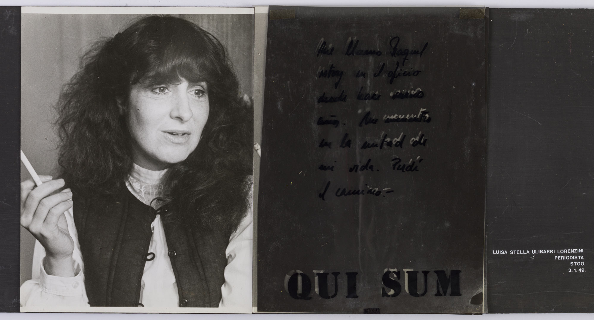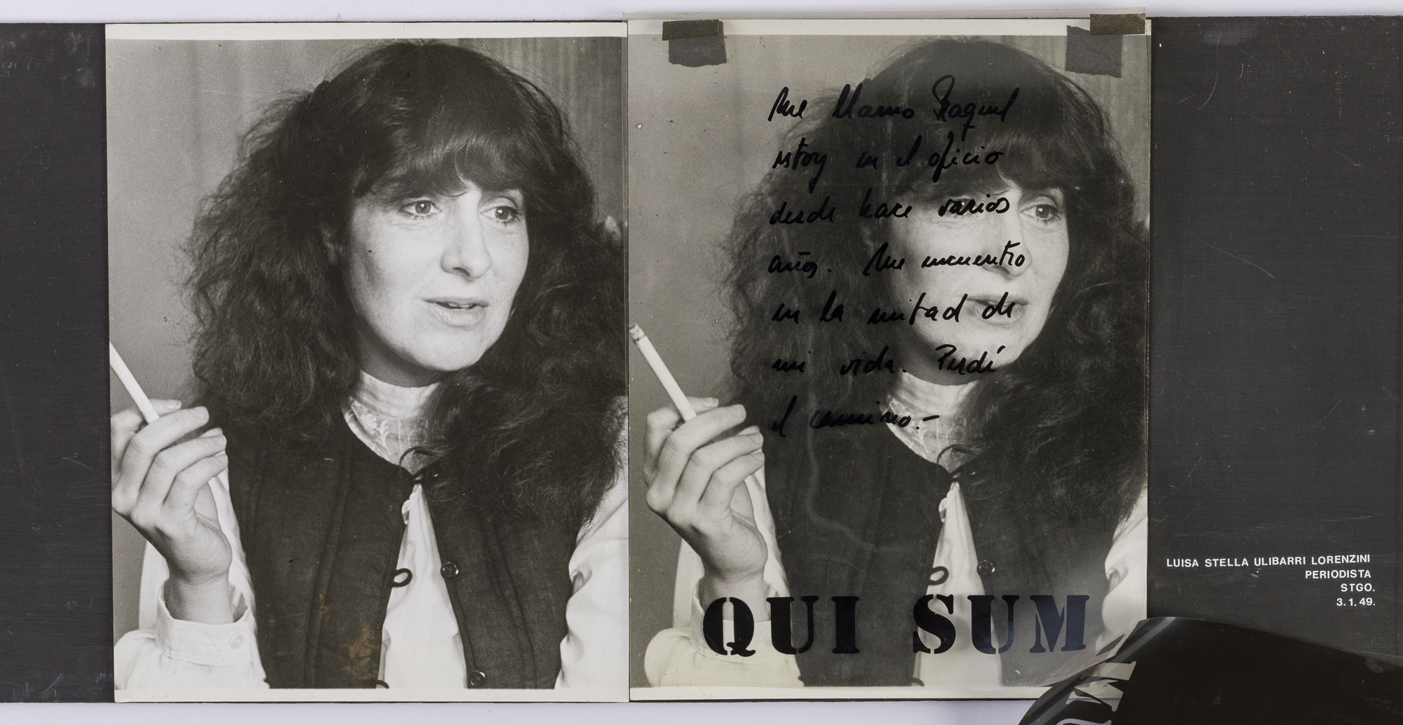 Fotografía en blanco y negro, de formato horizontal. Composición en base a dos retratos idénticos de una figura femenina de busto. La mujer viste chaleco oscuro, camisa clara y dirige la mirada al costado derecho. En la segunda imagen se observa una intervención en dos micas que cubren la fotografía, la primera de color negro y la segunda es tranparente, con palabras en negro, con sombras blancas.