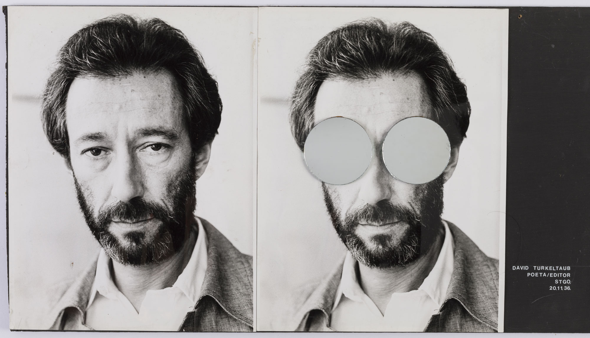 Fotografía en blanco y negro, de formato horizontal. Composición en base a dípitco con dos retrato idénticos de una figura masculina de busto. El hombre viste chaqueta oscura, camisa clara y dirige la mirada al frente. En la segunda imagen se observa una intervención con dos espejos circulares sobre los ojos del retratado. El fondo es claro y la iluminación es frontal.