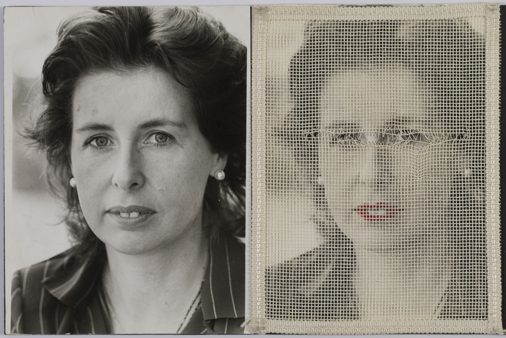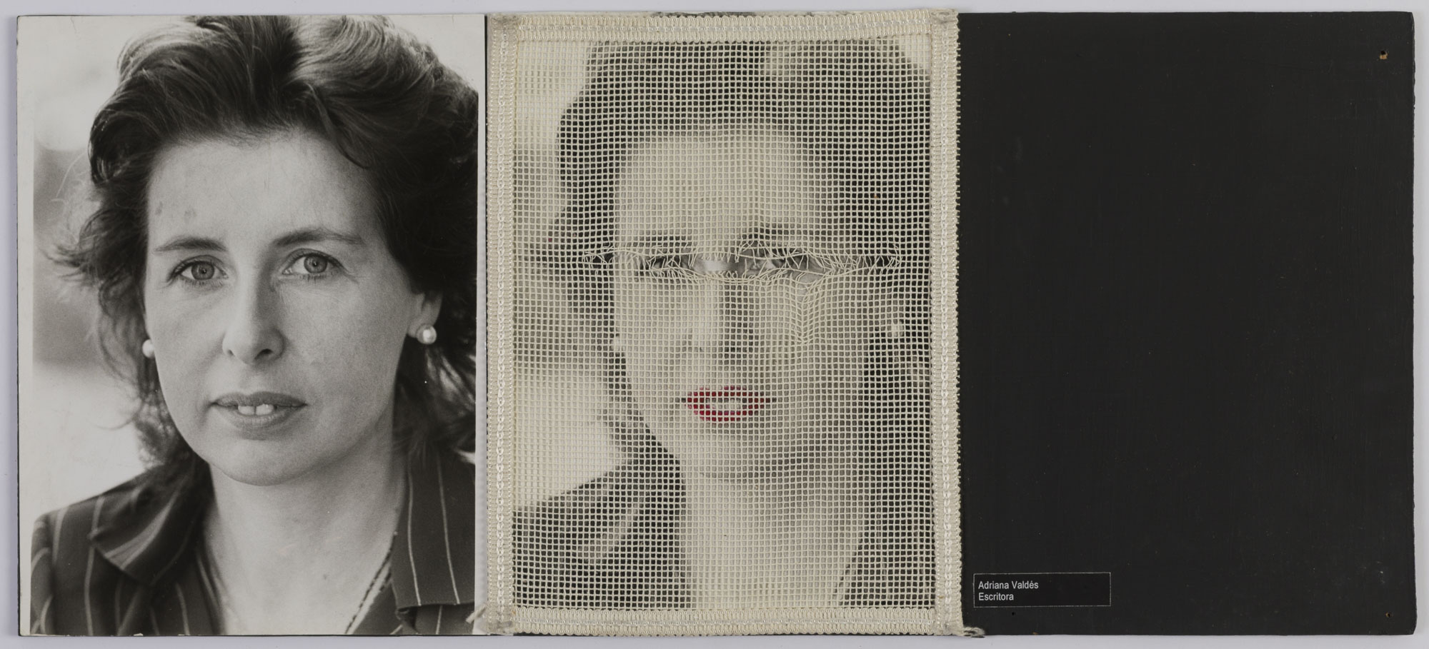 Fotografía en blanco y negro, de formato horizontal. Composición en base a díptico de dos copias de un mismo retrato de una figura femenina de busto. La mujer mira al frente, viste una camisa con patrón a rayas y aretes de perla. En la segunda imagen se observa una intervención textil de color blanco calado que cubre la fotografía por completo. La iluminación es frontal.