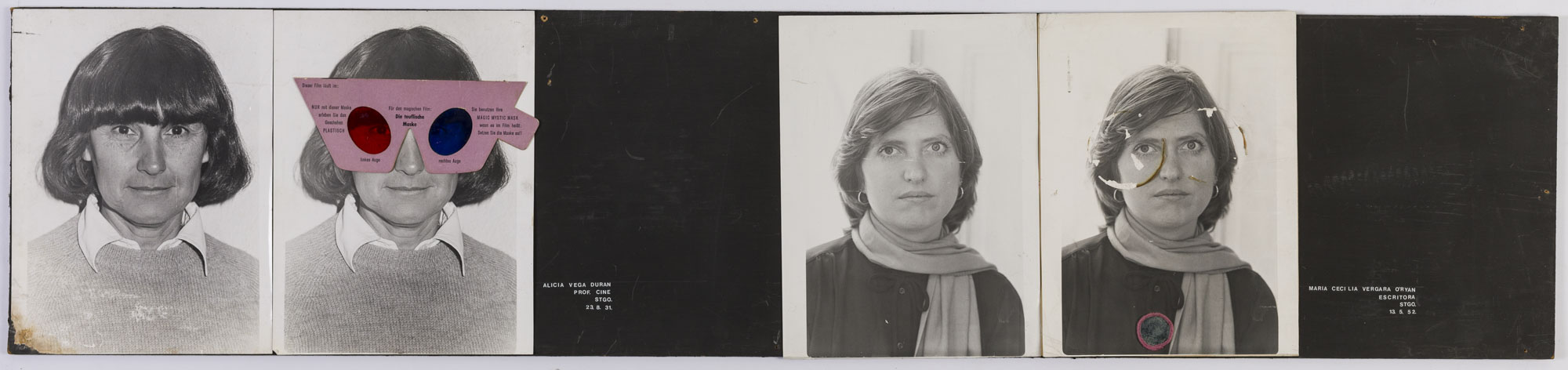 fotografía en blanco y negro, de formato horizontal. Composición en base a díptico con dos copias idénticas de un mismo retrato de una figura femenina de busto. La mujer viste suéter oscuro, camisa clara y dirige la mirada al frente. En la segunda imagen se observa una intervención en la zona superior del rostro de la retratada con una figura sobrepuesta de solor rosado, rojo y azul, con textos mecanografiados en negro. El fondo es claro y la iluminación es frontal.