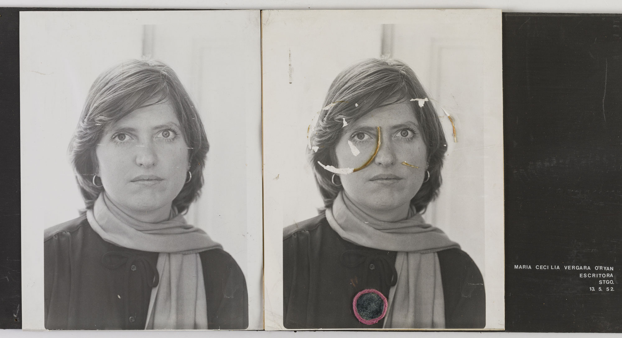 Fotografía en blanco y negro, de formato horizontal. Composición en base a díptico con dos copias idénticas de un mismo retrato de una figura femenina de busto. La mujer viste polera oscura, pañuelo claro al cuello y dirige la mirada al frente. En la segunda imagen se observa una intervención sobre el rostro y en el centro del pecho con un elemento de color rosado cilcular. El fondo es claro y la iluminación es frontal.