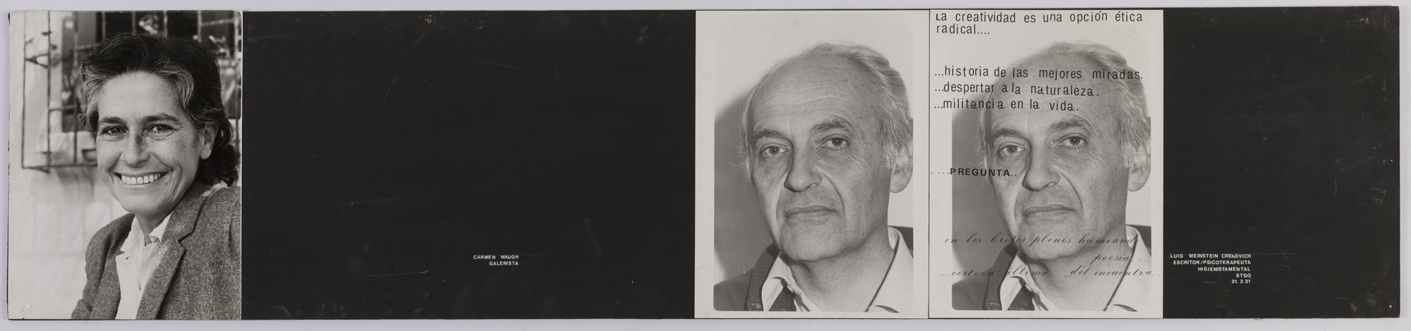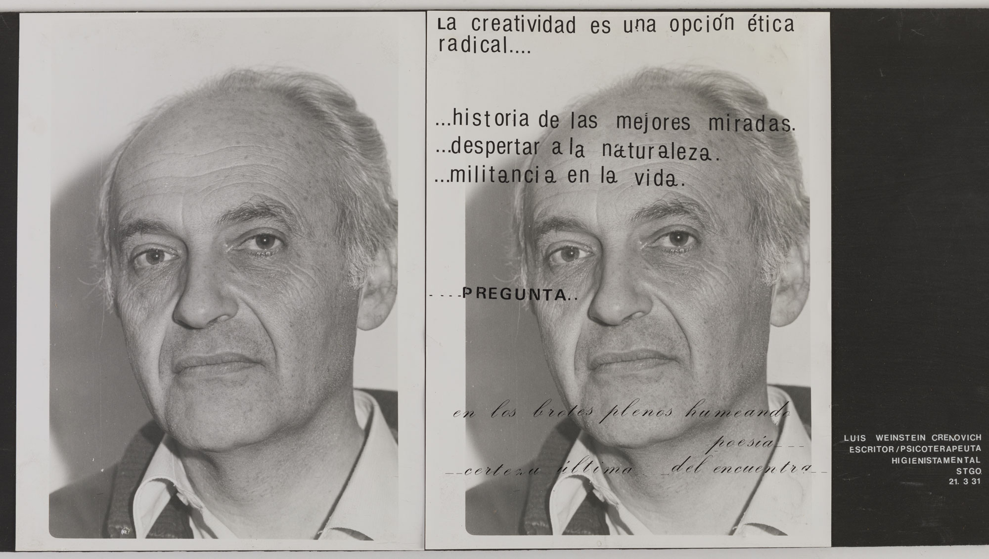 Fotografía en blanco y negro, de formato horizontal. Composición en base a díptico con dos copias idénticas de un mismo retrato. Le figura masculina viste chaleco oscuro, camisa clara y mira al frente. En la segunda imagen el retrato se ve intervenido por palabras en diferententes tipografías. El fondo es claro y la iluminación es tenue.