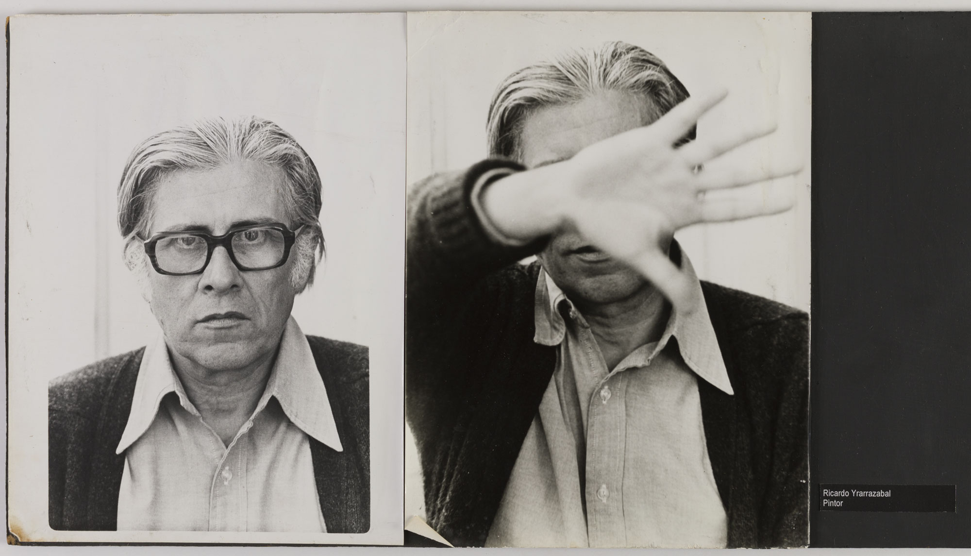 Fotografía en blanco y negro, de formato horizontal. Composición en base a díptico con dos imágenes distintas. En la primera imagen se observa el retrato de una figura masculina de busto, viste camisa clara, chaleco oscuro y lentes de marco grueso. En la segunda imagen se observa la misma persona retratada con la palma abierta y levantada, cubriendo gran parte del rostro. El fondo es claro y la iluminación es frontal.