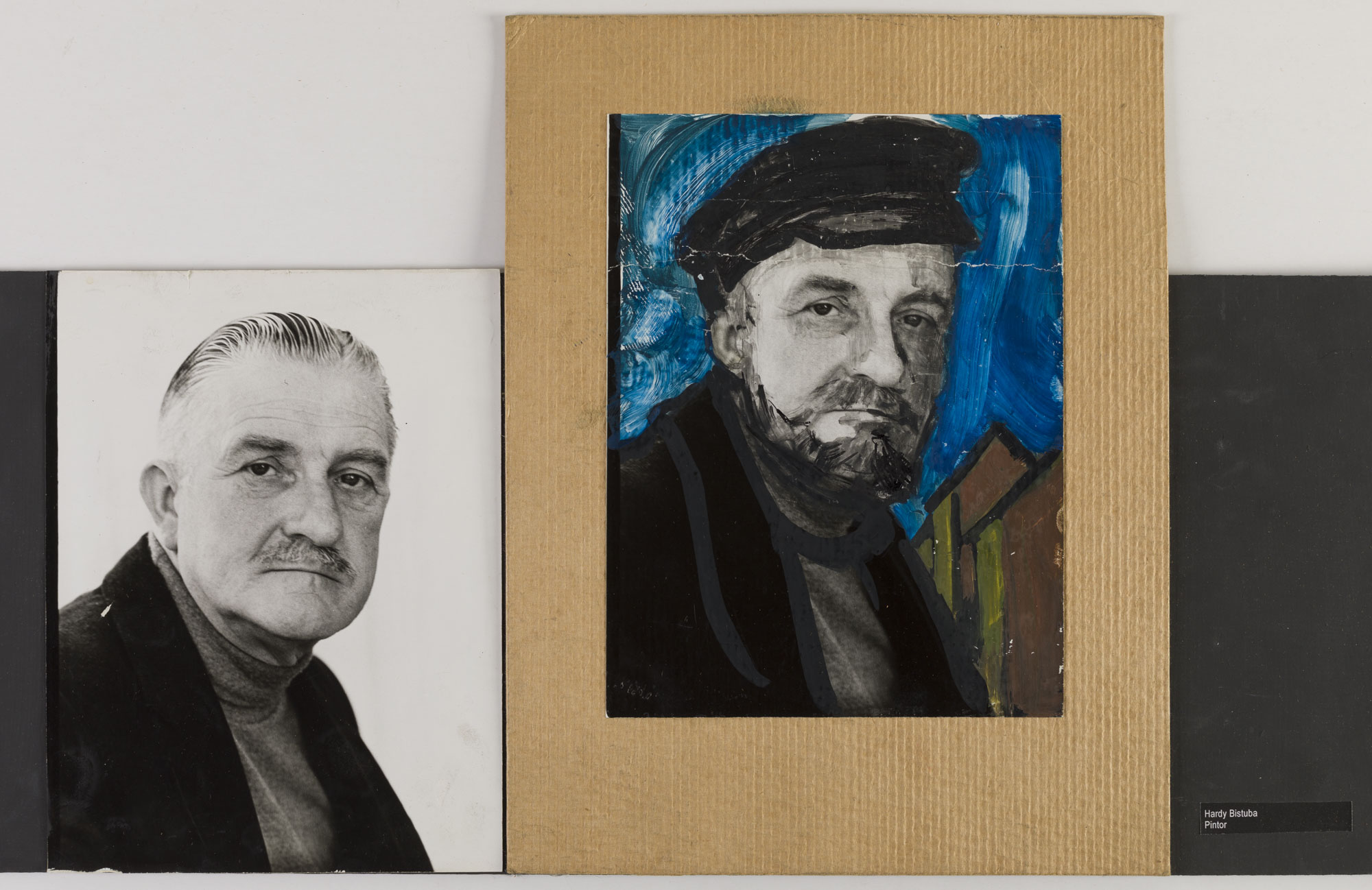 Fotografía en blanco y negro, de formato horizontal. Composición en base a díptico de dos copias idénticas de un mismo retrato de busto. El hombre viste una chaqueta oscura, un chaleco al cuello y mira al frente. En la segunda imagen se observan intervenciones en pintura de color negro en el rostro, cabeza y de color azul, amarillo. El fondo es claro y la iluminación es frontal.