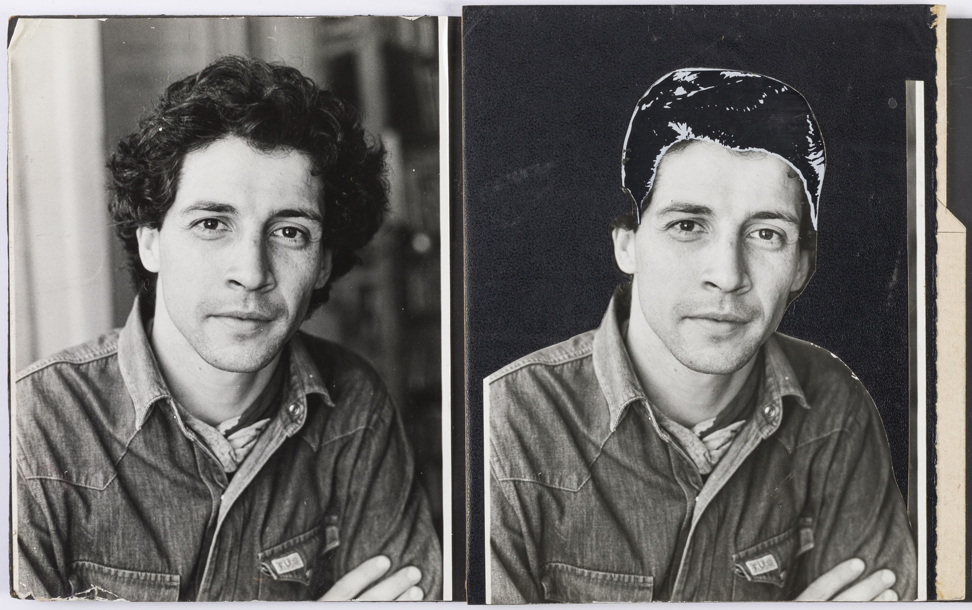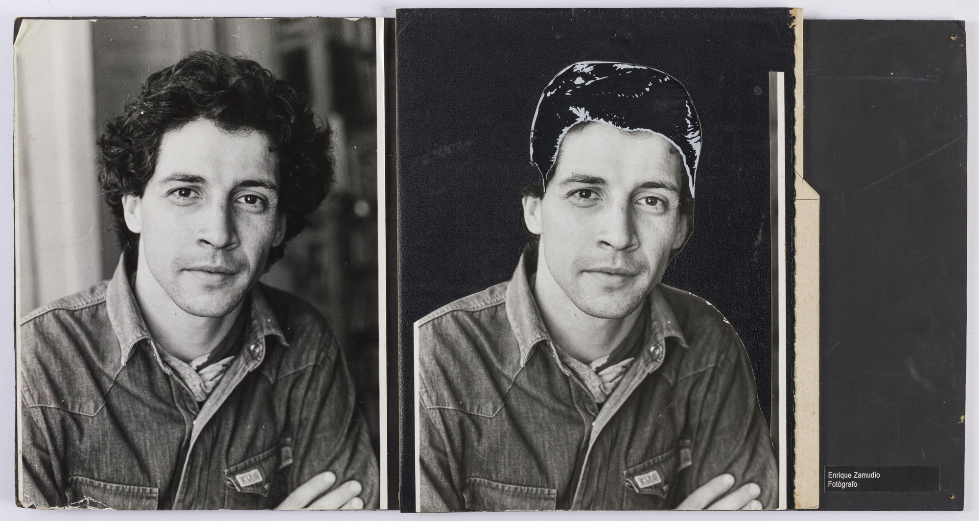 Fotografía en blanco y negro, de formato horizontal. Composición en base a díptico con dos retratos idénticos de una figura masculina de busto. El hombre viste camisa oscura, un pañuelo verde al cuello y dirige la mirada al frente. El fondo en semi oscuro y la iluminación es tenue. En la segunda imagen se observa una intervención al fondo de color negro y al cabello del retratado, en negro y blanco.