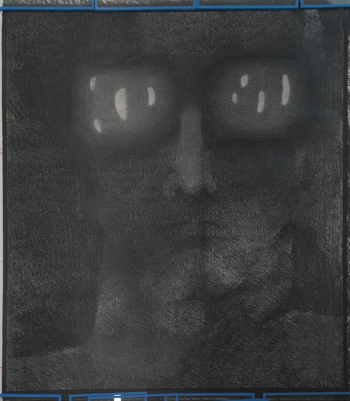 Obra de formato rectangular y orientación vertical. Composición en tonos grises en base a rostro humano con gafas en primer plano. En cada lente hay cuatro brillos en gris claro. Los labios se encuentran cerrados. La barbilla del rostro tiene una hendidura al medio.