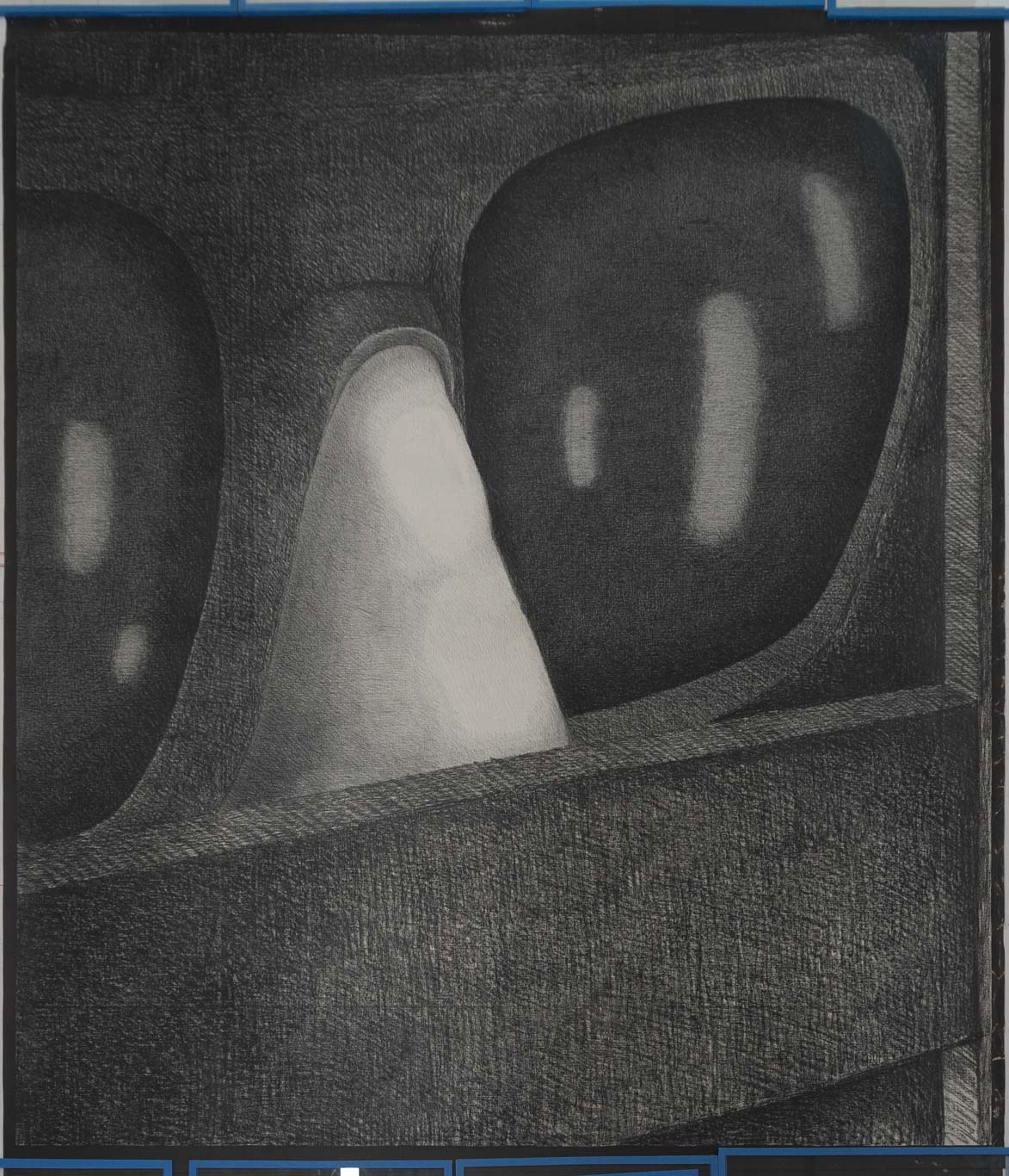 Obra de formato rectangular y orientación vertical. Composición en tonos grises en base a un rostro de gran tamaño. La figura lleva puestos unos lentes oscuros de marco negro, y, por sobre, su nariz y labios pasa una tabla rectangular que lo cubre.