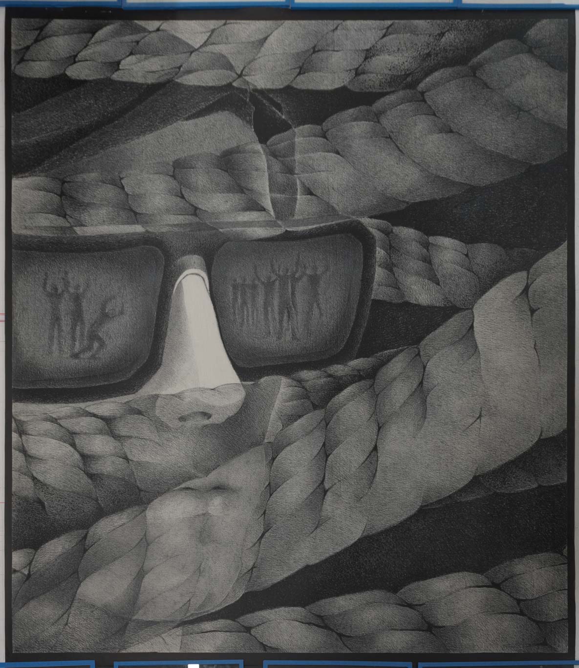 Obra de formato rectangular y orientación vertical. Composición en tonos grises en base a la representación de un rostro humano, que lleva el cabello corto, lentes oscuros que no permiten ver sus ojos. en el cristal de sus anteojos se reflejan figuras humanas de pie y con los brazos en alto. Por sobre el rostro de la figura central, se cruzan varios trozos de cuerdas.