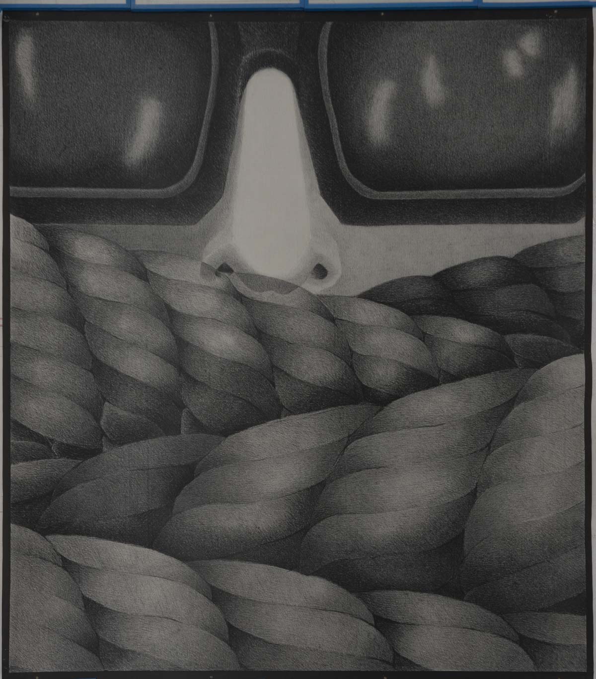 Obra de formato rectangular y orientación vertical. Composición en tonos grises en base a representación en primer plano de varios trozos de cuerdas dispuestas horizontalmente. En la zona superior, en segundo plano, se distingue un rostro, al que solo se le ve la nariz y sus lentes oscuros. Obra de color negro y gris.